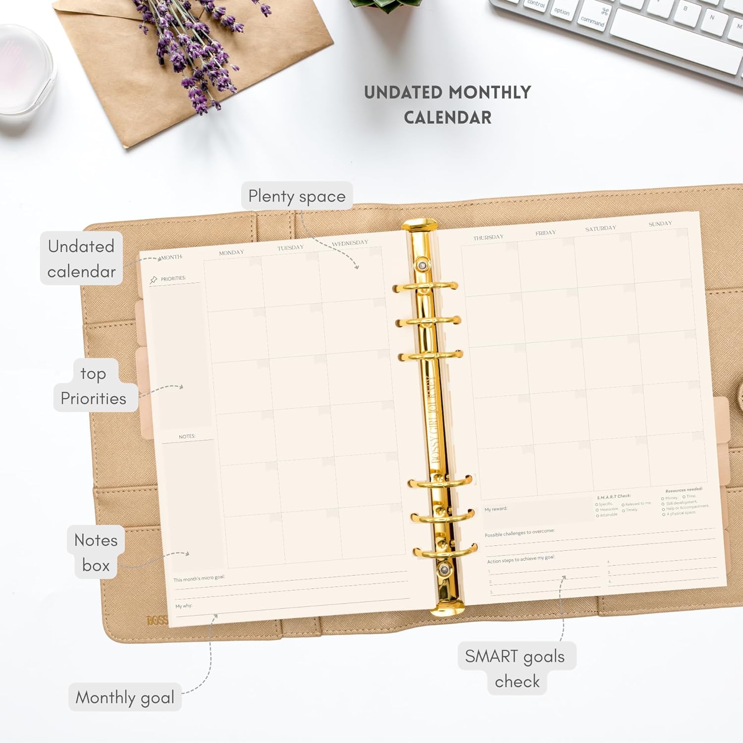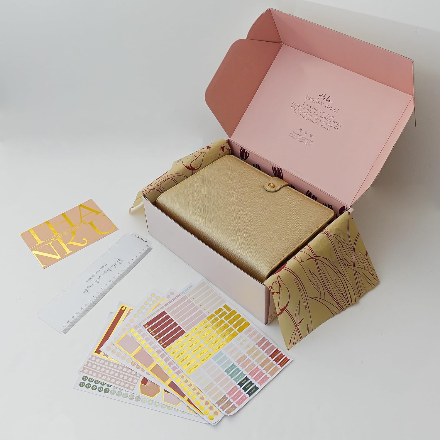 Bossy Girl Journey - A5 Daily Planner Binder – Undated Time Blocking Refillable Organizer for Women with 110gsm Paper, PU Leather Cover, Stickers, Dividers, Pen Loop, Gift Box – Goal Setting & Productivity (Gold)