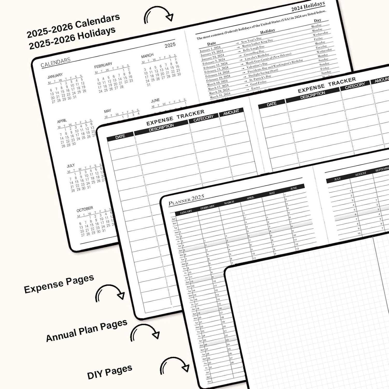 - EXTRA PAGES: This daily planner 2025-2026 also contains 2025-2026 Yearly Overview Page, 2025-2026 Holiday, Calendar Page, DIY Pages, Expense Tracker Pages, bookmark ribbons and binding band allow you to quickly browse and locate the current date