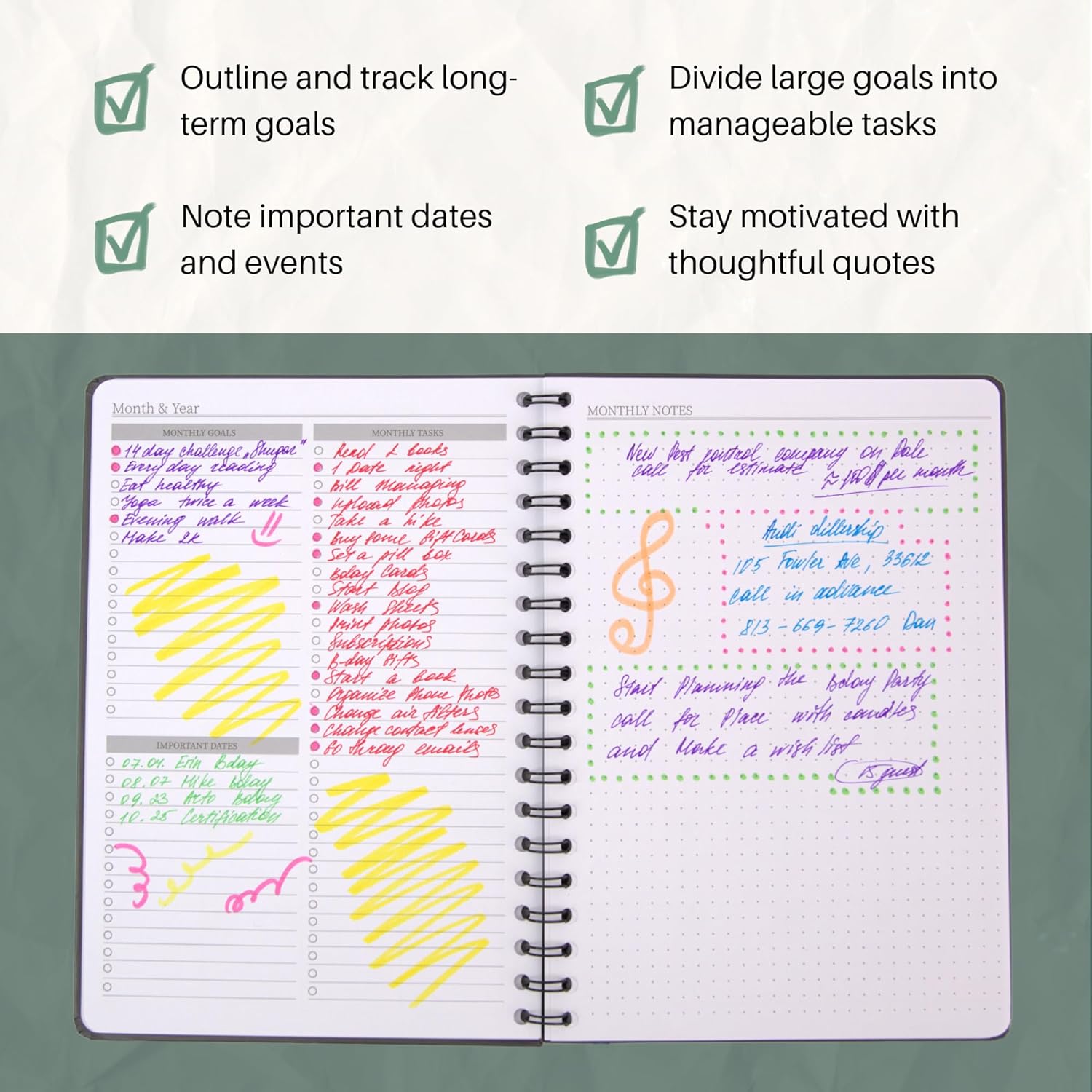 - Premium Quality - Made beautiful and tough to withstand the rigours of your busy lifestyle and look good doing so! Adorned with a hardcover and tear-proof outer cover to hold strong against bumps and scuffs,120 GSM thick pages to prevent bleed and metal spiral binding to hold it all planner notebook 2025-2026 together.