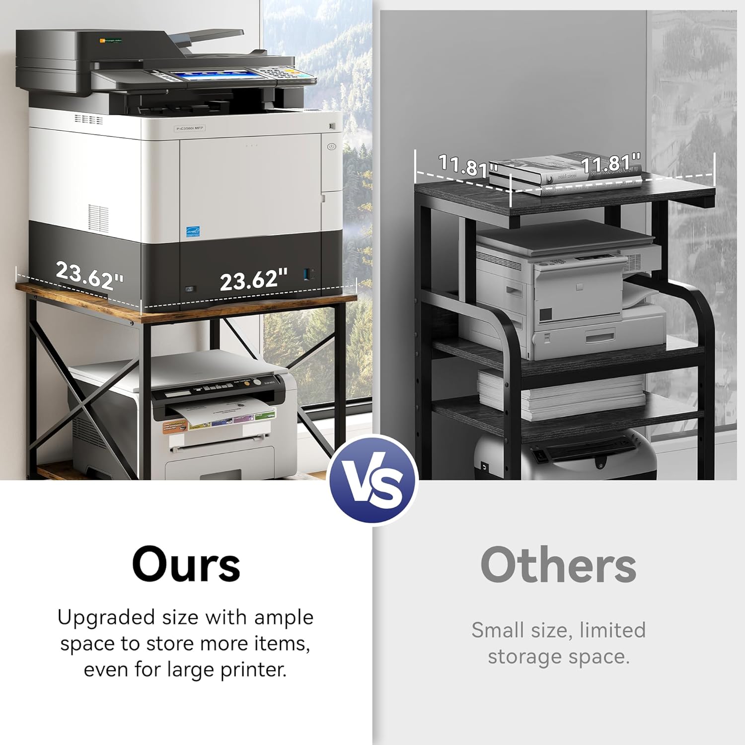 - 【Oversized Countertops Storage Space】2 tier printer stand with large storage space of 23.62''L x 23.62"W x 23.62"H to accommodate kinds of office items. This 24 inch wide office stand can be used to hold printers, scanners, fax machines as well as copy paper, folders, books, letters, documents, etc. It is an ideal printer table for home office.