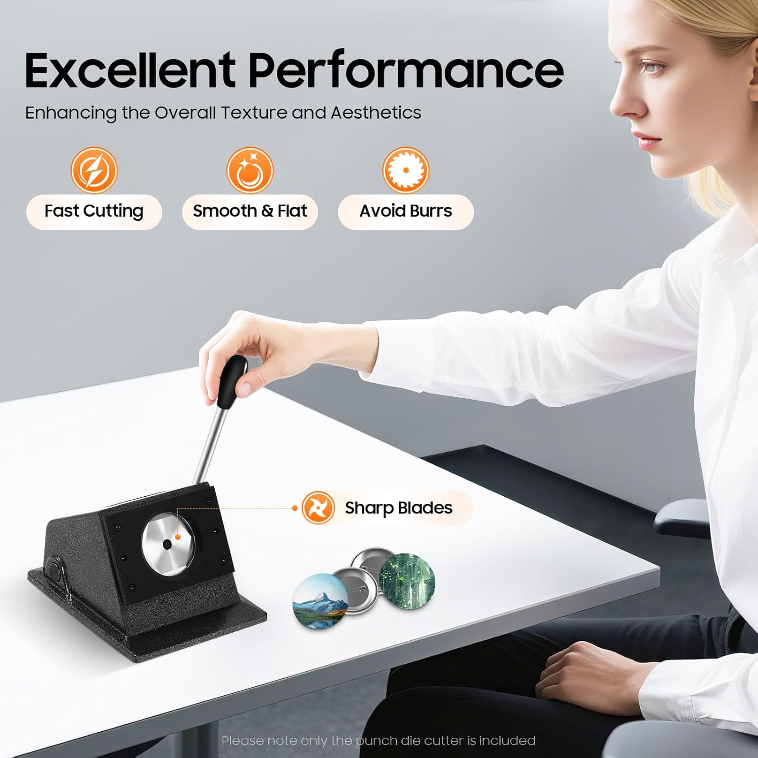 - Precision Cutting Performance with Pin Button Cutter β Cuts perfect 2.28" (58mm) diameter circles for badges, medals, and crafts. Handles paper (up to 0.66 lbs), thin leather, and cardboard (β€0.076mm thickness) with smooth edges.