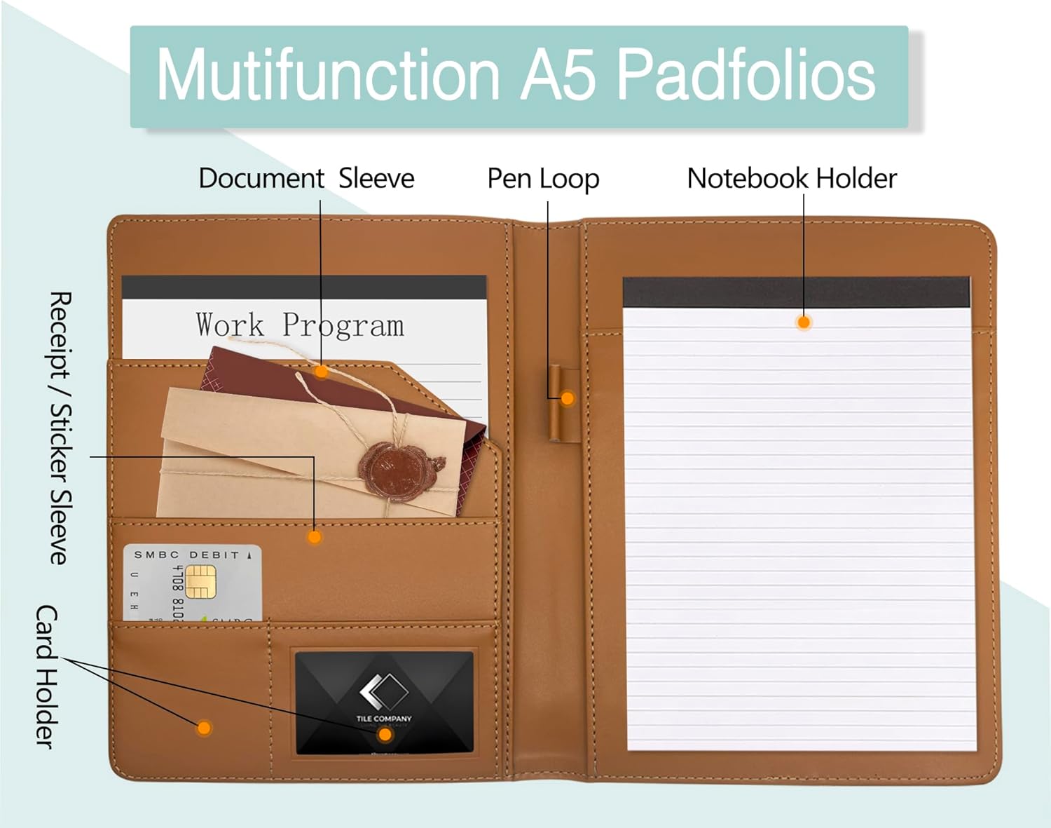 - 【Simple Design Portfolio】The mini portfolio binder has enough pockets in the inside for business cards, ID, notes and a pen loop, looking very professional and elegant. This A5 portfolio is very well made of good quality PU leather and is very easy to carry with you for quick meetings at work or other daily use. (paper and pen are NOT included).
