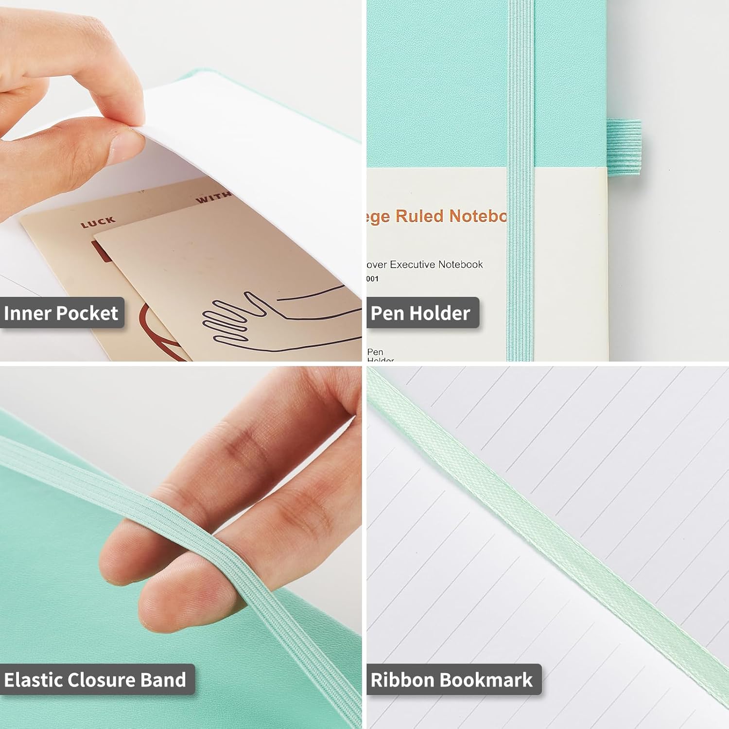 - Inner Pocket + Elastic Closure Band+ 1 Ribbon Bookmark+ Pen Loop - The notebook includes a inner pocket and for storing sticky notes, receipts, and other small items. The elastic band is strong to hold the whole notebook and ribbon bookmarks that can be used to keep your place, the pen loop to keep your pens. These design making it a versatile tool for all aspects of life.
