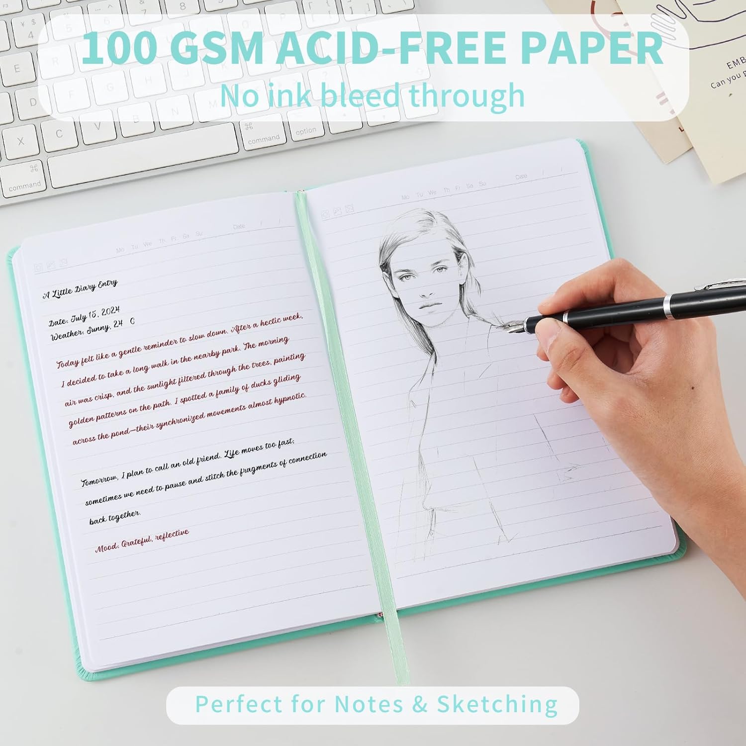 - Premium Thick Notebook Paper: 160 Pages (80 Sheets) -using 100gsm thick paper, pages are 25% thicker than others 70-80gsm paper, which suitable for most pen types, ballpoint pens, brush pens, fineliner pens, glitter pens, resulting in minimal ghosting or bleeding.