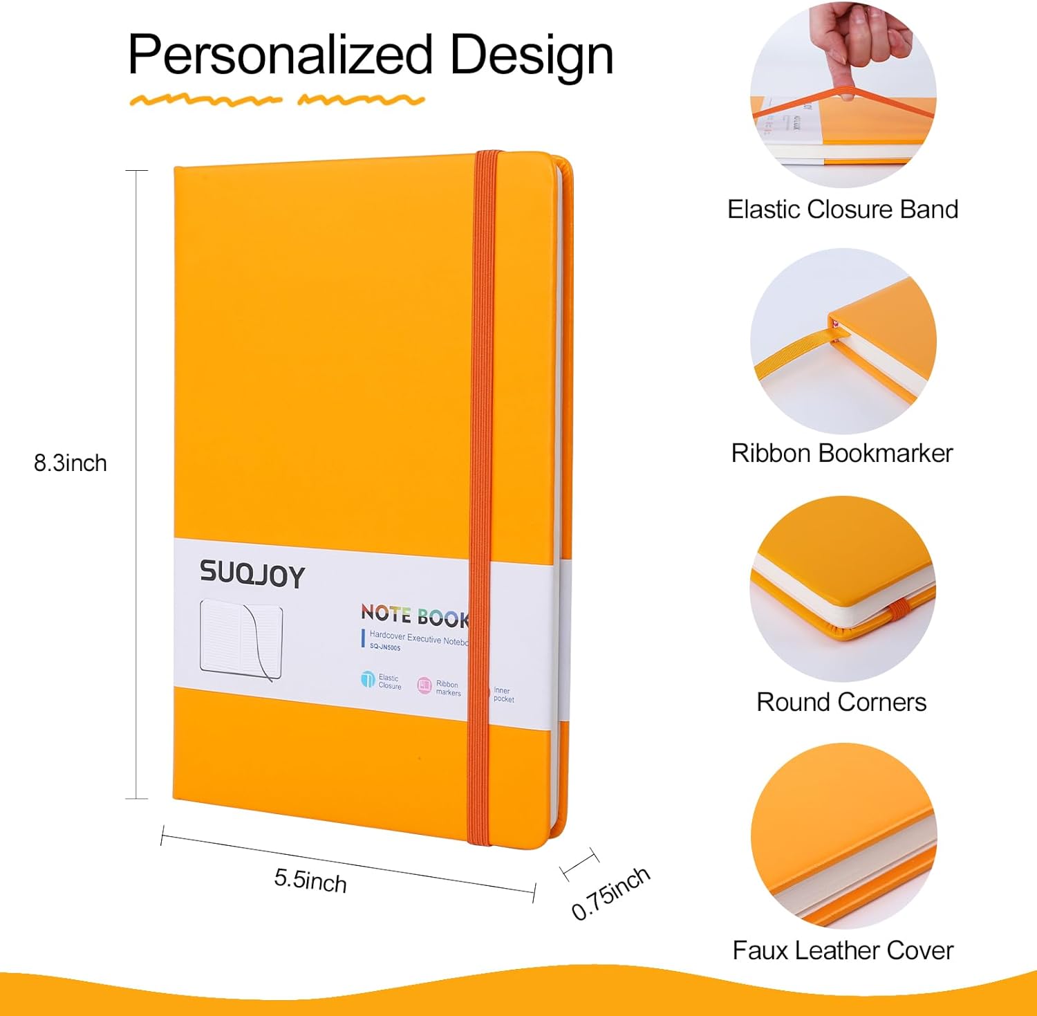 - Hardcover Leather Journal: SUQJOY medium 5.5×8.3 inches A5 lined journal, is made of waterproof faux leather, providing enhanced protection for the inner pages. 160 college ruled lined pages, with an expandable inner pocket, a ribbon bookmark, and an elastic closure band.