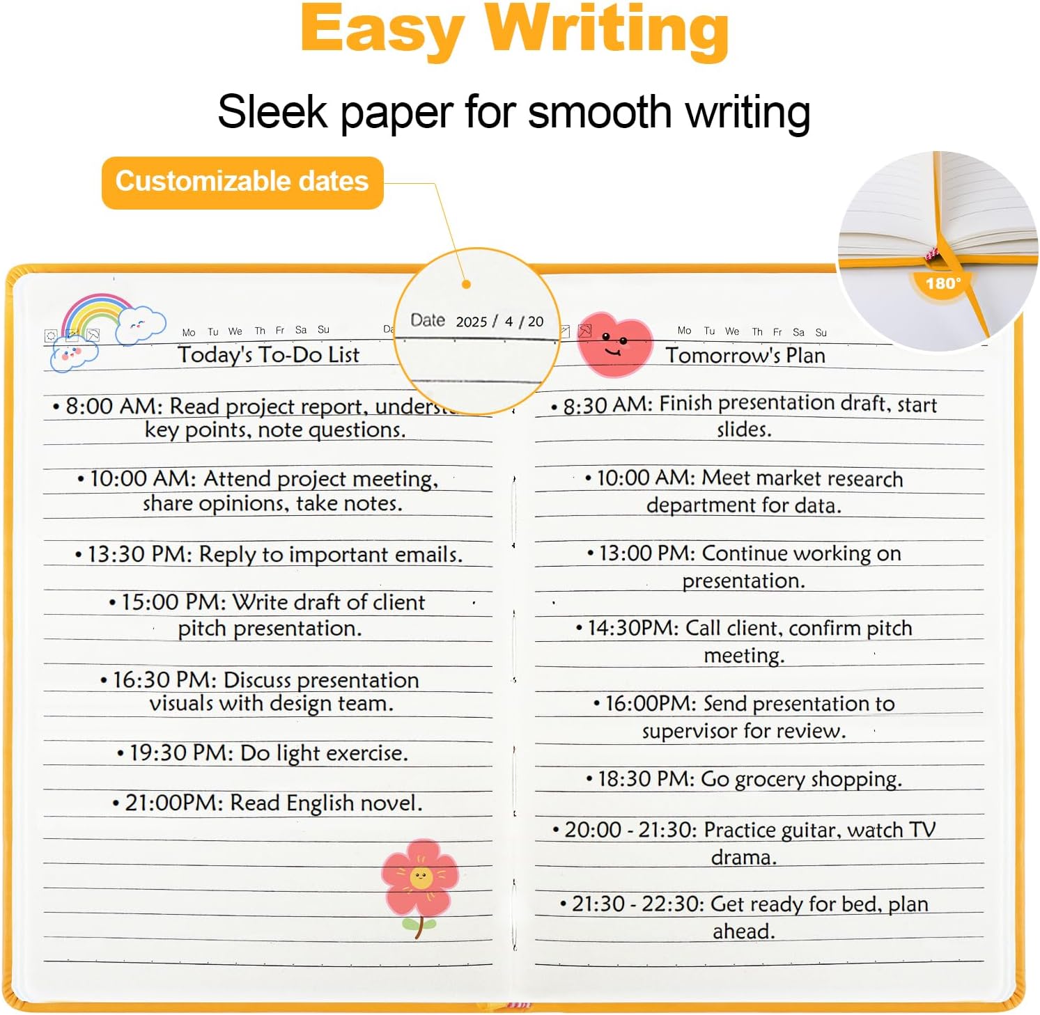 - 180° flat-lay design: The 180° flat-lay design makes writing a breeze. Every page lies flat on the table, no closing or bending. Whether you're left or right-handed, it gives a smooth writing experience, helping you capture every inspiration easily.
