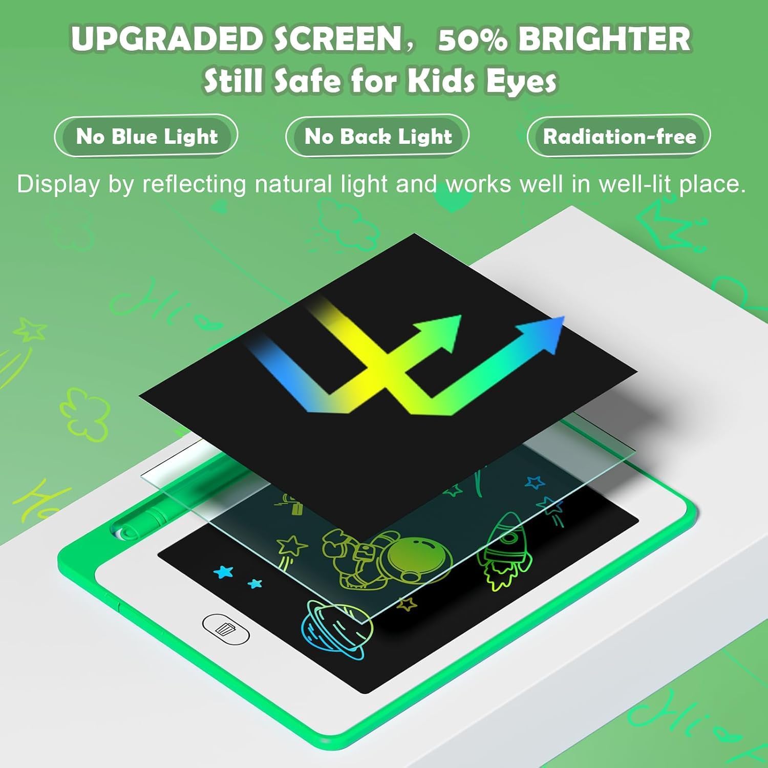 - 6.5 Inch Eye Protection & Colorful Lcd writing Tablet: OMXDG kids LCD doodle board is a creative education and learning toy, perfect support for drawing, writing, spelling, math, remark, and notes which can let your kids freely release their natural instincts. With erase button on the front and lock switch. You can draw and erase easily by pressing the button on the front of the board. The pen fits snug on top of tablet and it will not come loose.