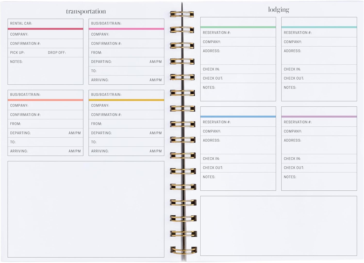 - COMPREHENSIVE TRAVEL PLANNER: 120 pages of structured layouts for organizing transportation, reservations, destinations, and more.