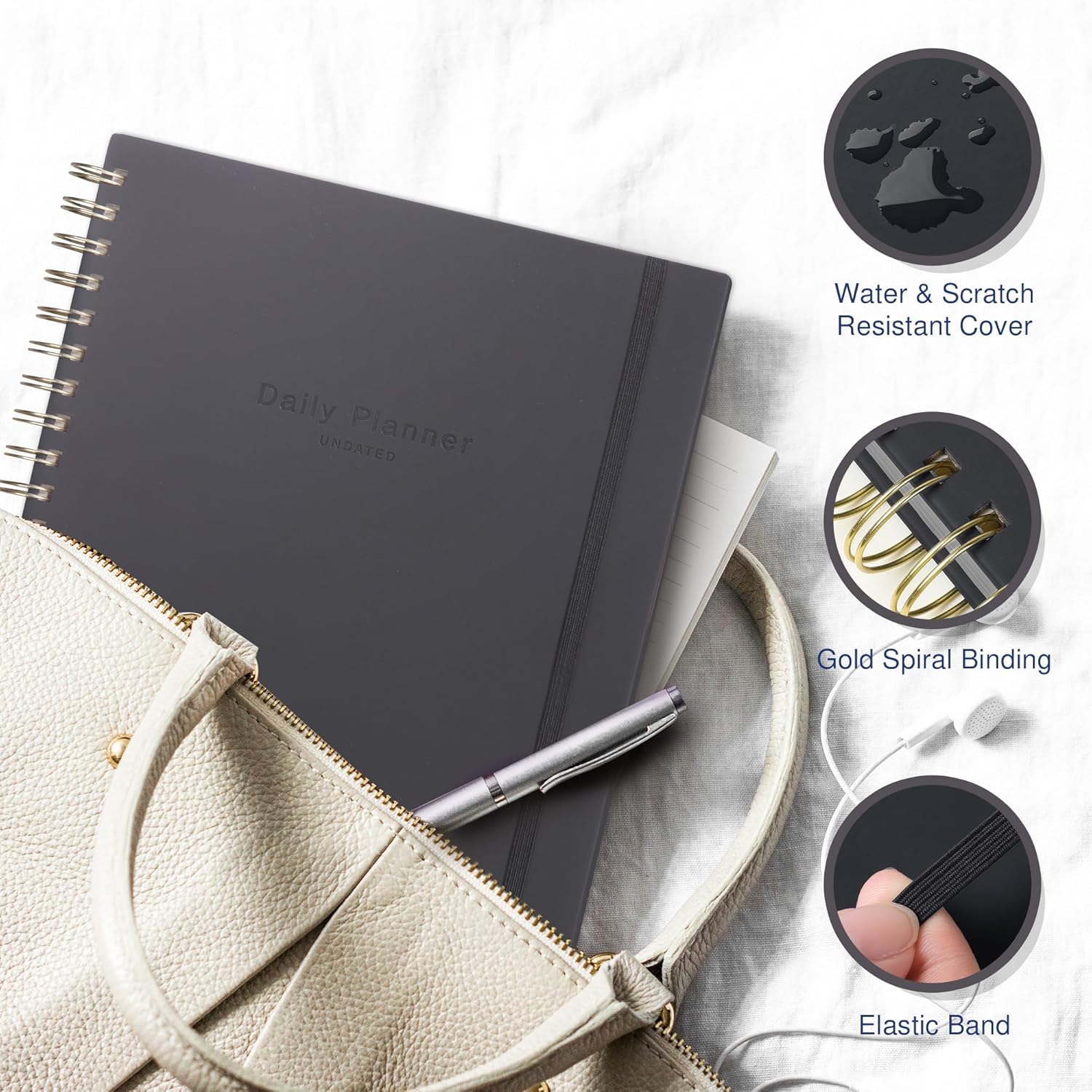 Undated Daily Planner To Do List Hourly Schedule 2027 2026 2025 Calendar & Holiday Habit Tracker 180 Pages Letter Size 8.5" x 11" Sheets Hardcover Spiral Bound Notebook (Black)