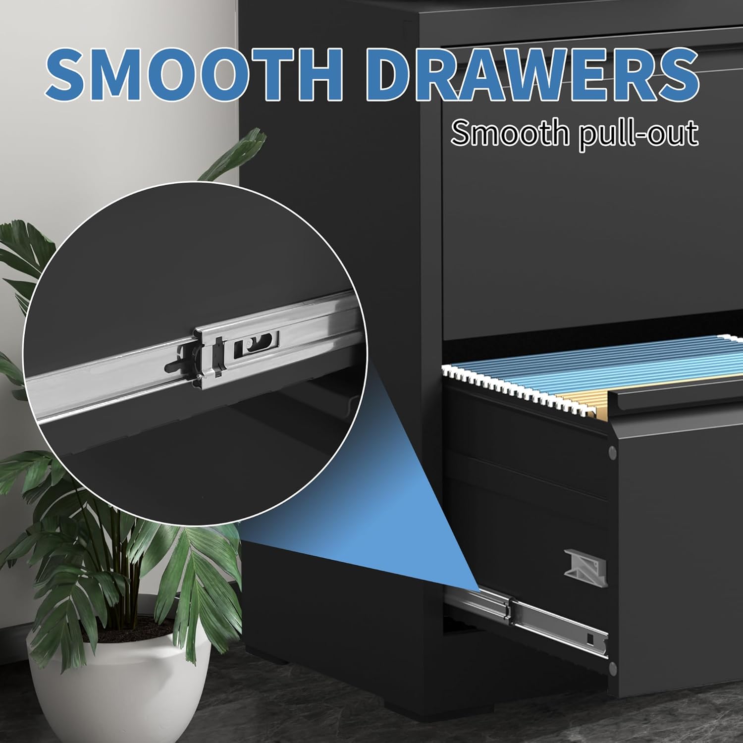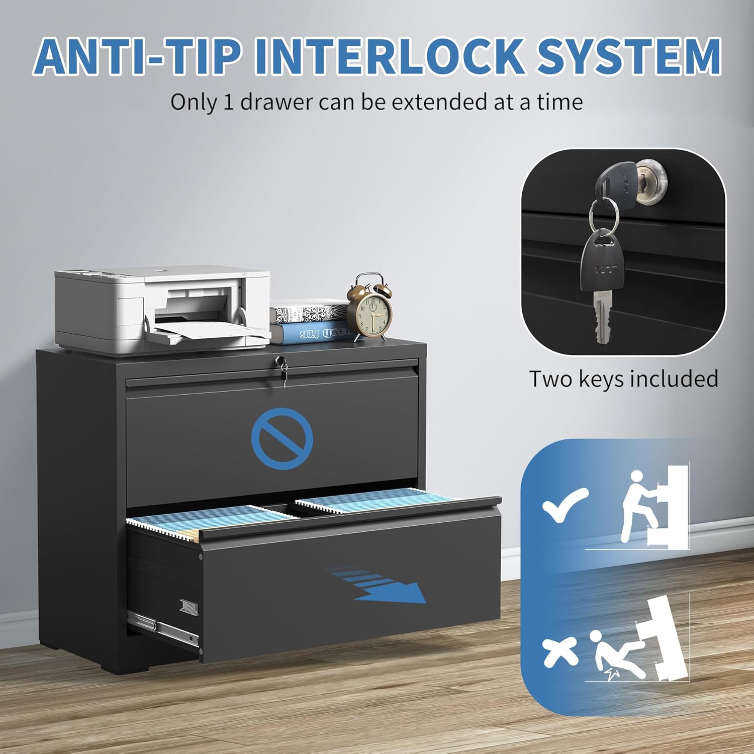 - ăEnhanced Safety Featuresă To prevent tipping hazards, FLIXELIO 2 drawer file cabinet with lock includes a built-in anti-tip mechanism that allows only one drawer to open at a time. This thoughtful design minimizes safety risks and ensures stability, even when multiple drawers are in use.