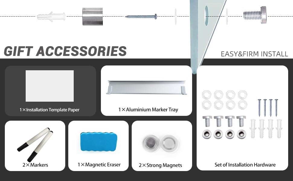 - Sleek, Functional Design Modern frameless aesthetic with a sturdy aluminum marker tray included—perfect for keeping markers and erasers organized within easy reach.