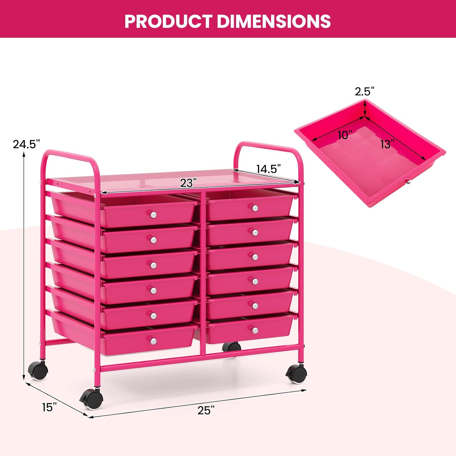 Giantex 12 Drawers Rolling Cart, Mobile Storage Drawer Cart, Classroom Organizer Cart for Office School Supplies Tools Scrapbook Paper Craft Small Printer, Utility Cart on Wheels, Hot Pink