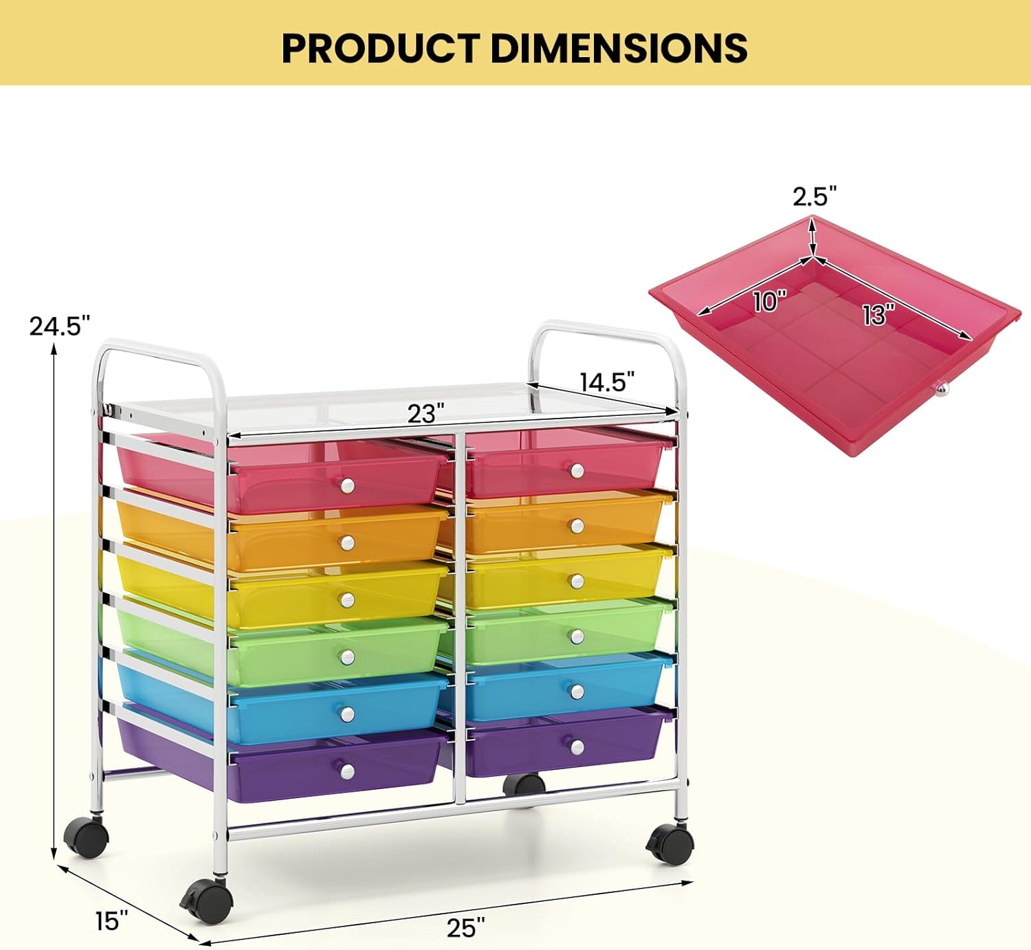 - [Large & Classified Storage Space]: The storage cart features 12 removable drawers in different vibrant colors, allowing you to easily categorize and access your items. More, you will no longer be bothered about messy room.