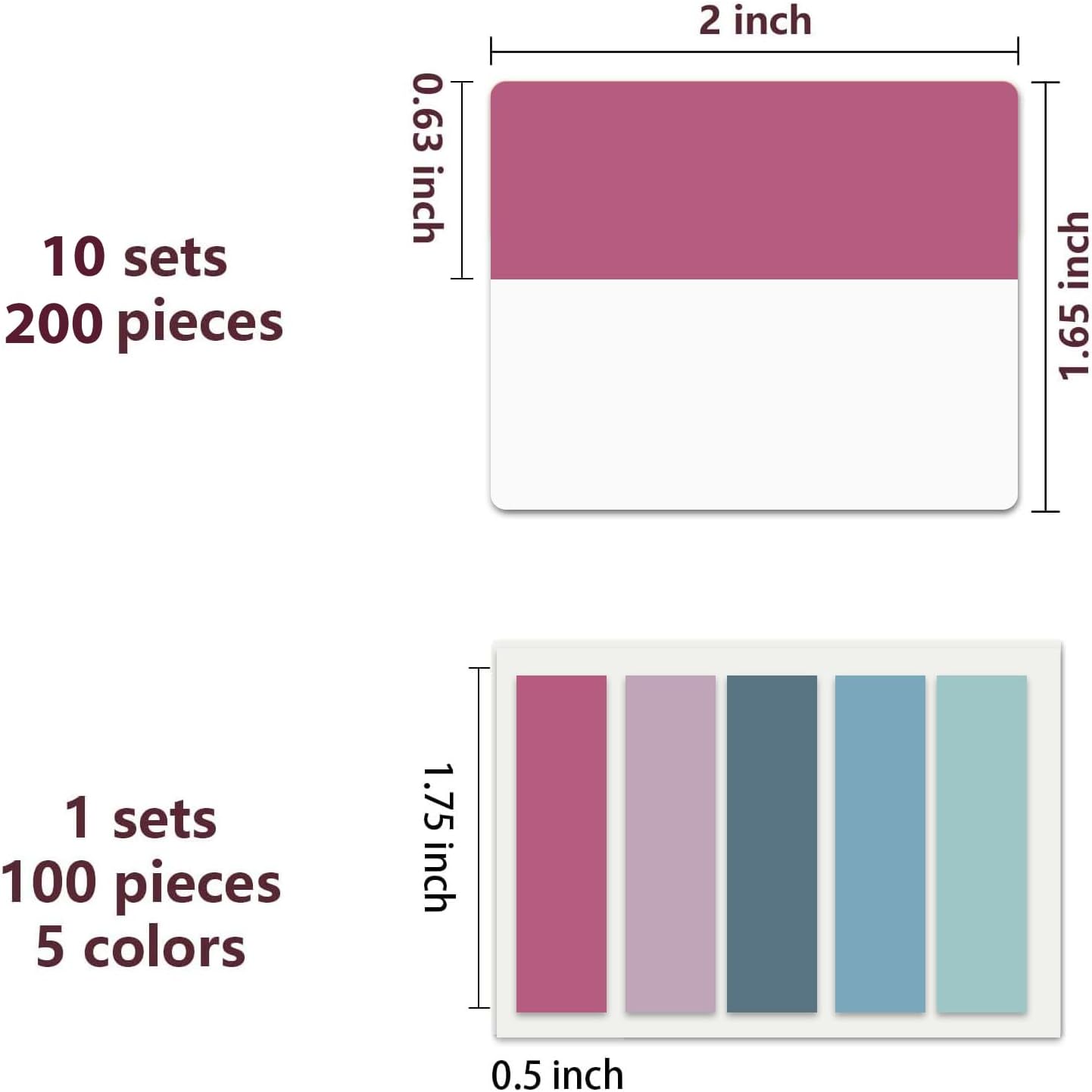 - 300pcs Book Tabs: 300 pcs 21 sets in total, 200 pieces 2 inch sticky tabs in 10 sets with different pastle colors,100 pieces 0.5 in tabs in 1sets, 20 pieces each color