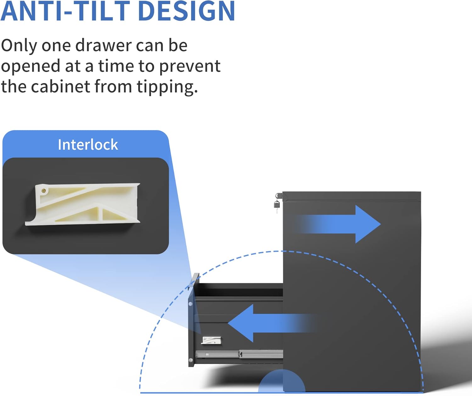 - ăAnti-tilt DesignăThis vertical legal file cabinet designed with full extension and steel ball-bearing suspension, all drawers of the file cabinets can be opened and closed quietly and easily. The anti-tilt system ensures that only one drawer can be open at a time, preventing the metal file cabinet from tipping over. You can have peace of mind knowing that your important documents and items are safe and secure.