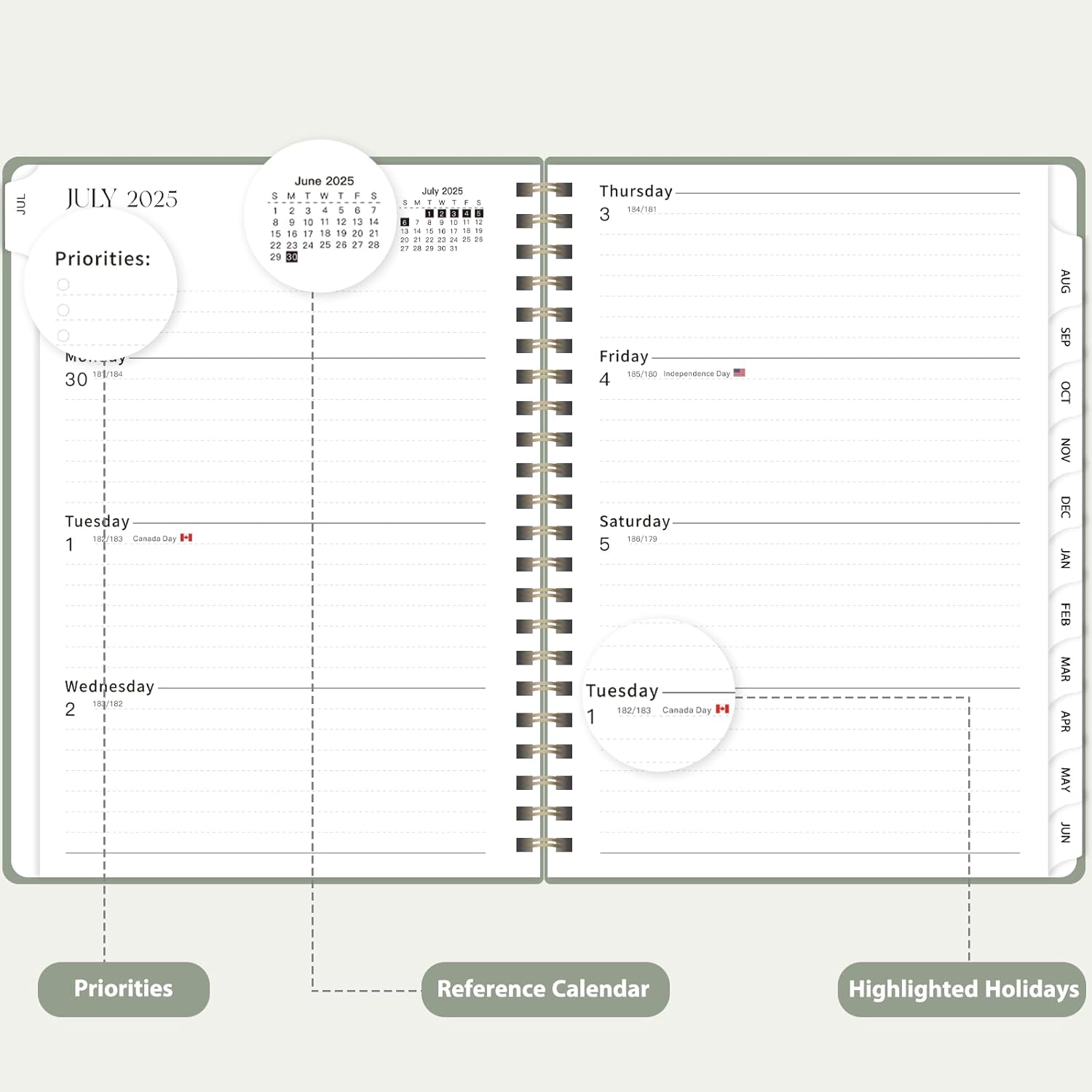 - [THOUGHTFUL DESIGN] β Printed on FSC-certified wood-based paper, our daily planner 2025-2026 comes with an elastic closure band, monthly tabs and a double-sided pocket for storage. Each month begins with a motivational quote to keep you motivated.