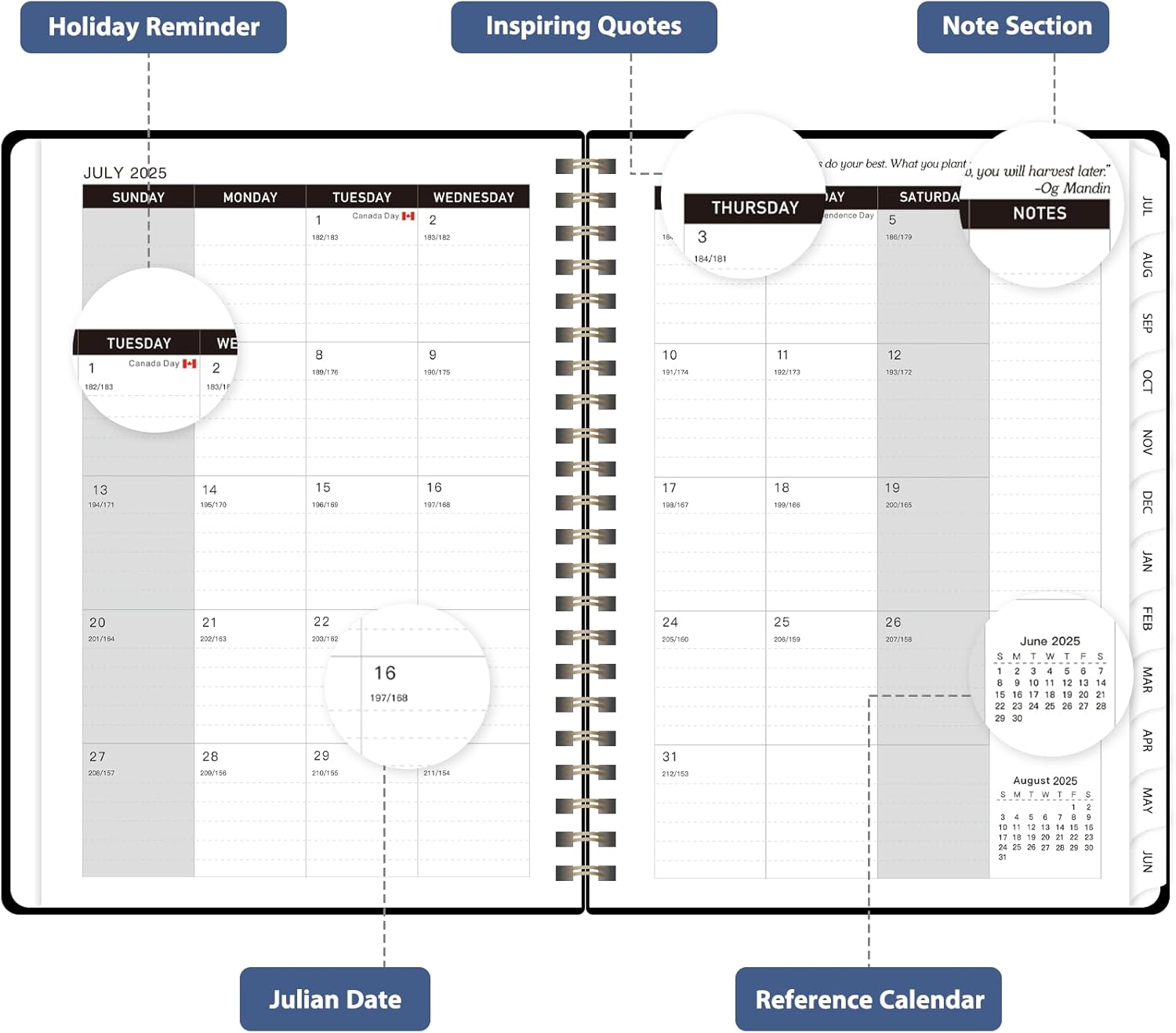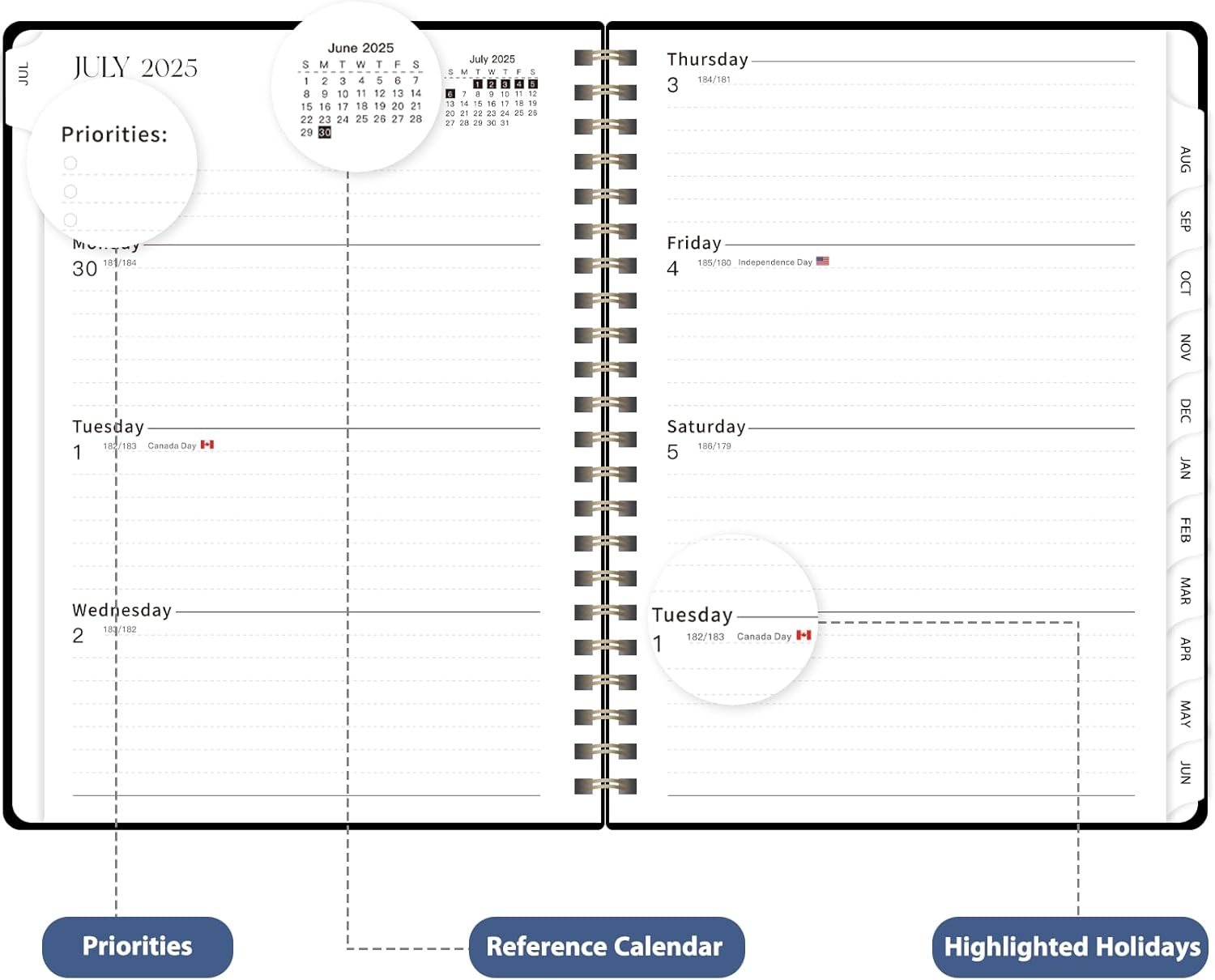 - [THOUGHTFUL DESIGN] β Printed on FSC-certified wood-based paper, our daily planner 2025-2026 comes with an elastic closure band, monthly tabs and a double-sided pocket for storage. Each month begins with a motivational quote to keep you motivated.