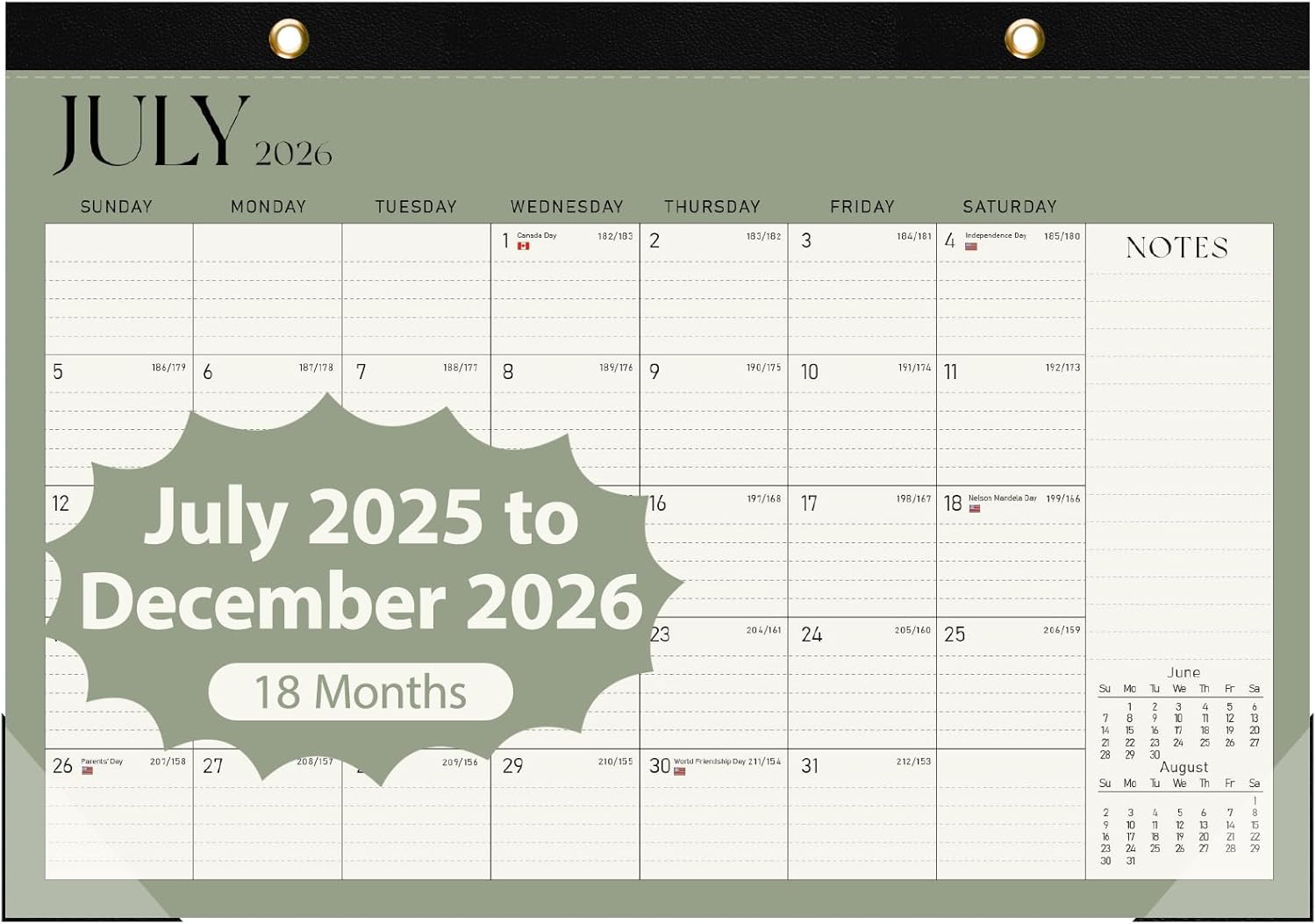 - [18 MONTHS CALENDAR] - Our 2025-2026 desk calendar (17"x12") covers 18 months from July 2025 to December 2026. With highlighted holidays and Julian dates, this calendar ensures you never miss an important deadline or event, making it perfect for long-term projects, school or teaching schedules, and work commitments.