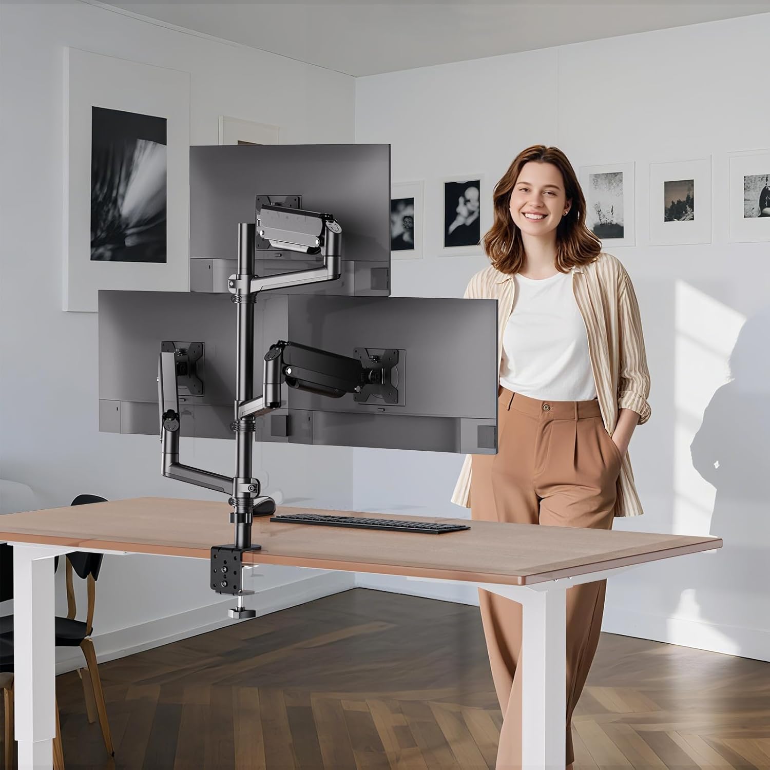- Full Motion Gas Spring Monitor Arm:The 3 monitor desk mount tilt your screen from +70° to -45°, swivel it 180°, and rotate it 360° from landscape to portrait, providing you an optimal viewing angle. This full motion monitor desk mount can be positioned or stacked in many different ways.