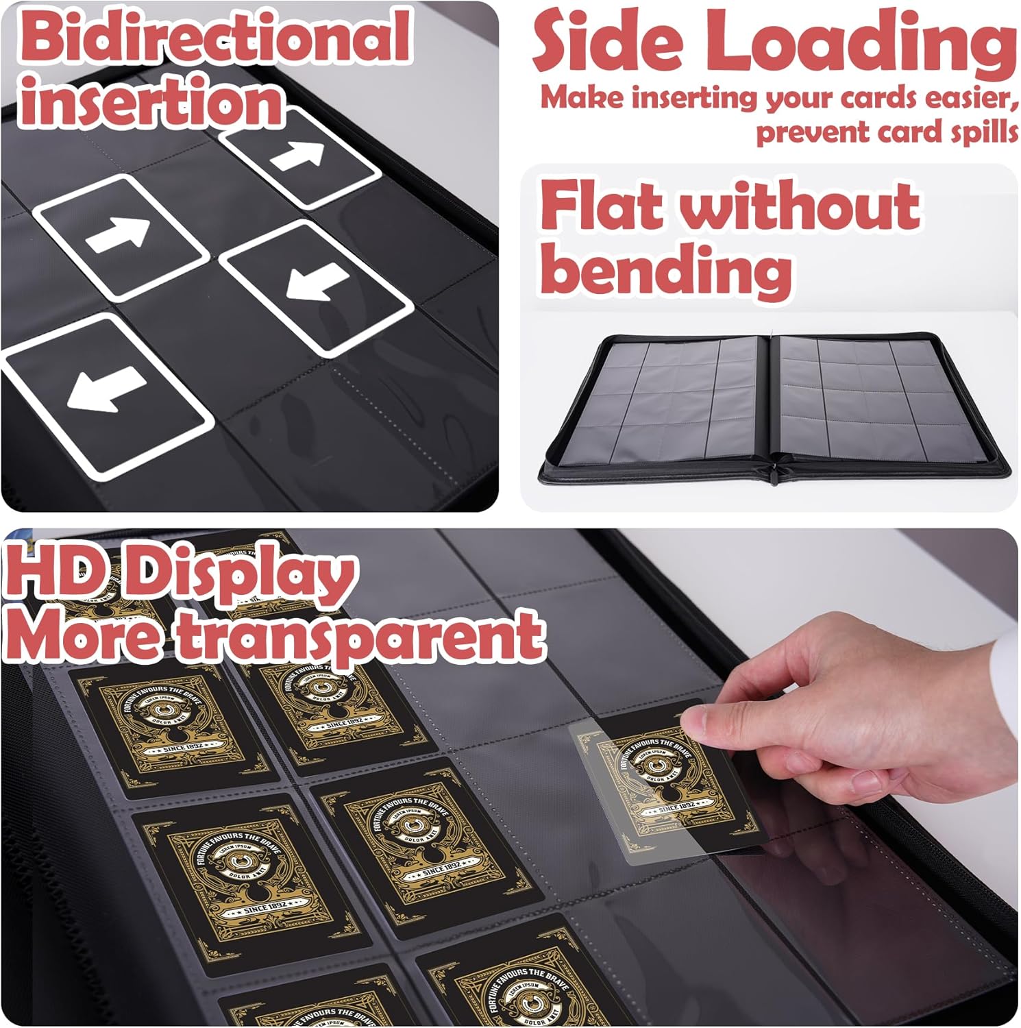 - Made To Last :our carrying case binder is comfortable to touch and hold in hands. The card binder for trading cards is made of premium PU leather, Water or raindrops won’t seep through. Closed zipper design provides multiple protections so that the inner page or cards does not fall.Handle straps design can carry around to show off cards to your friends