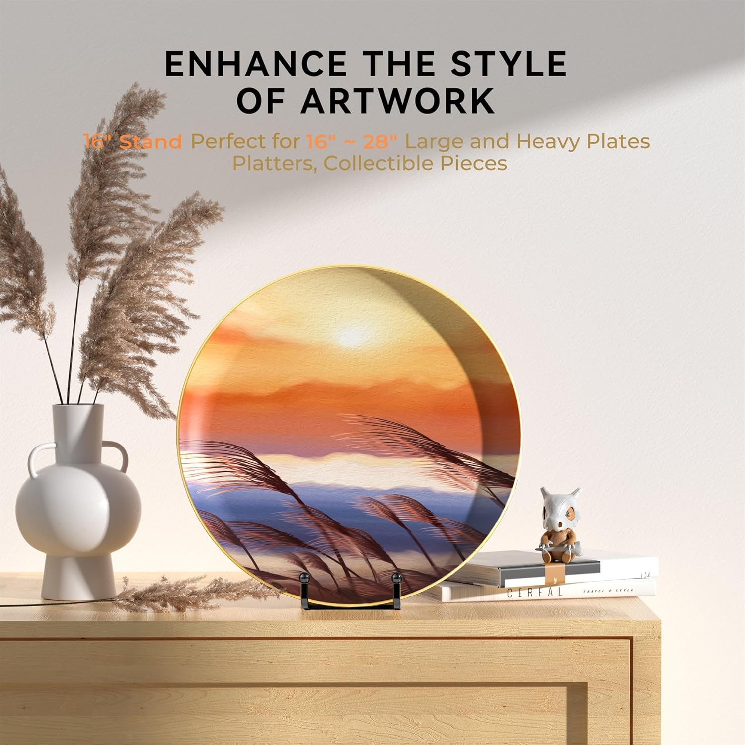 - Versatile 16 Inch Plate Holder: Designed with a 2.75-inch deep lip, 10° tilt angle, and a 5-inch wide base, this stand securely holds items from 16 to 36 inches tall and up to 25 lbs, making it perfect for extra large plates, platters, posters, picture frames, and decor.