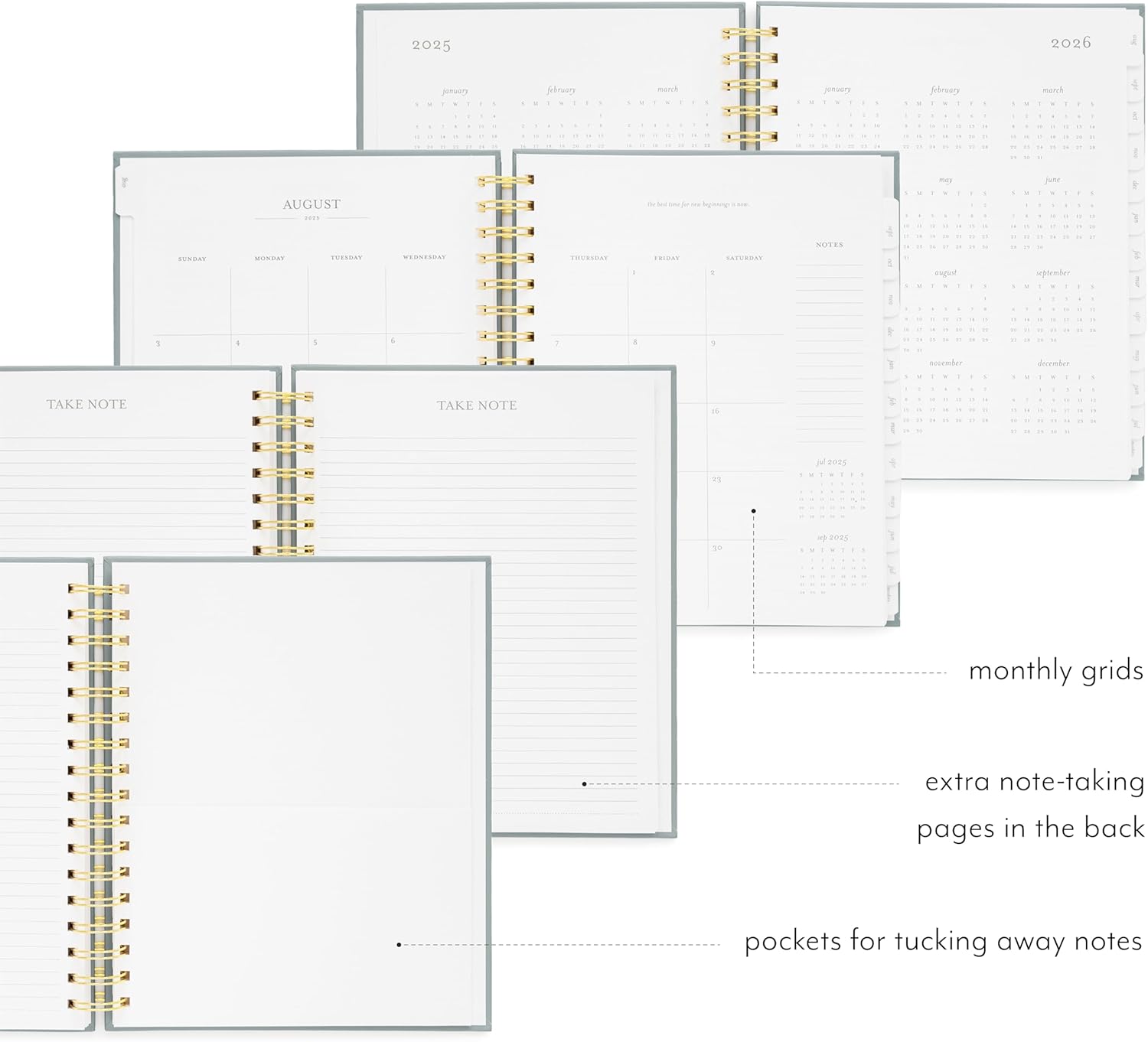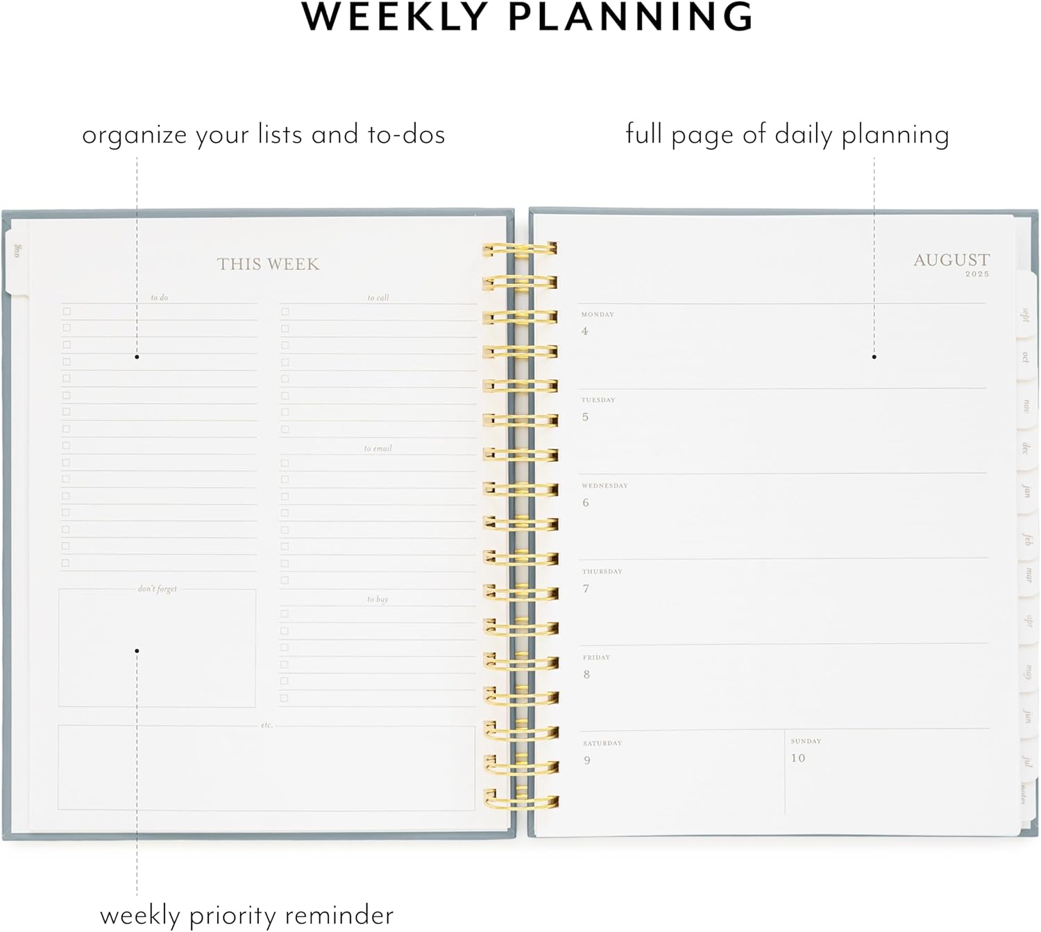 - PREMIUM QUALITY MATERIALS β Crafted with a durable matte-paper hardcover and a sturdy gold spiral binding, this agenda is designed to last. Featuring crisp white text paper with soft grey ink, it provides a smooth writing surface that resists ink bleeding. Thoughtfully designed for everyday use, this planner combines style and durability for students and professionals alike.