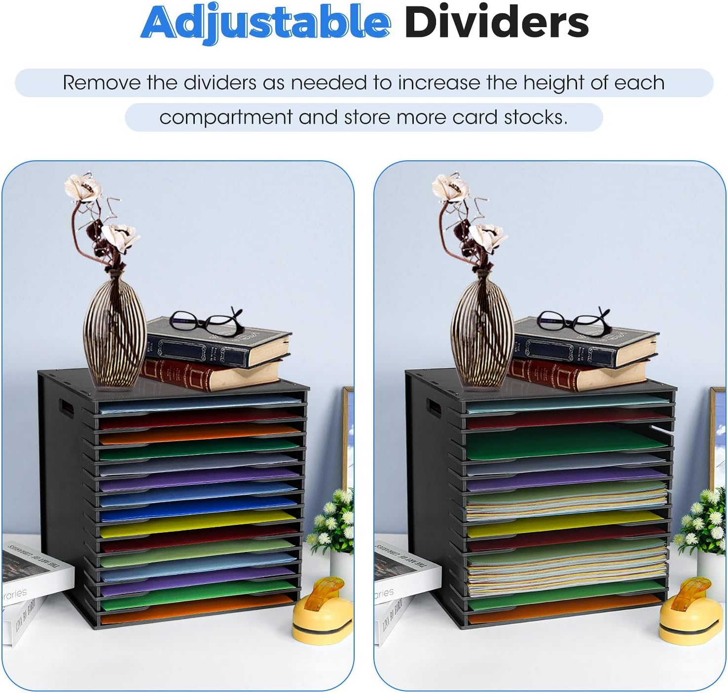 - Adjustable Layer Heights - The scrapbook paper rack has adjustable dividers, allowing you to adjust the height of each layer to accommodate different crafting materials and supplies. Tailor your storage to your needs and enjoy the flexibility our rack offers for your creative projects
