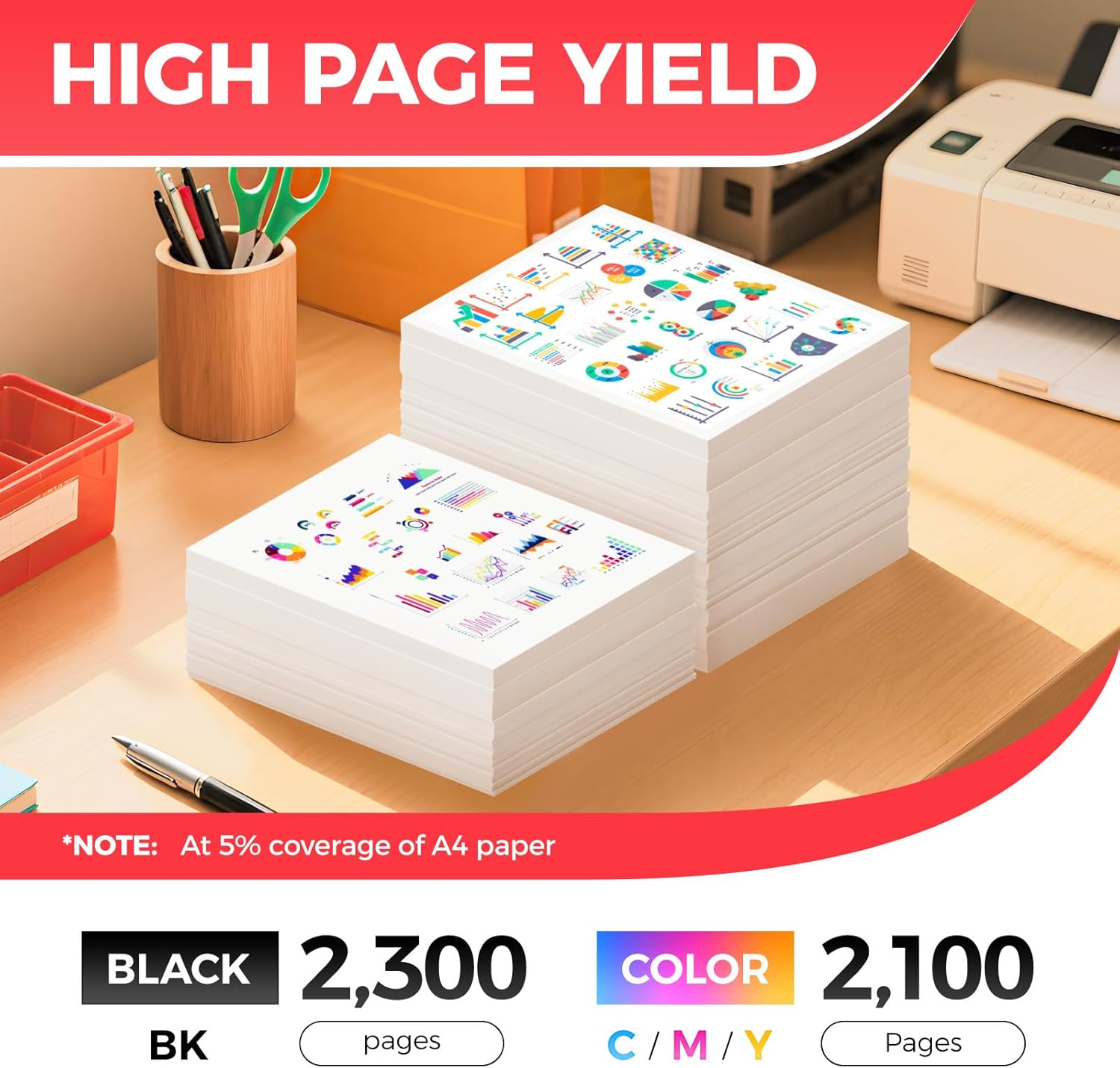 - High-Yield: up to 2,300β¬ pages per 055/055H Black and 2,100 pages per 055/055H Color (Total 8,600 pages, 5% coverage).
