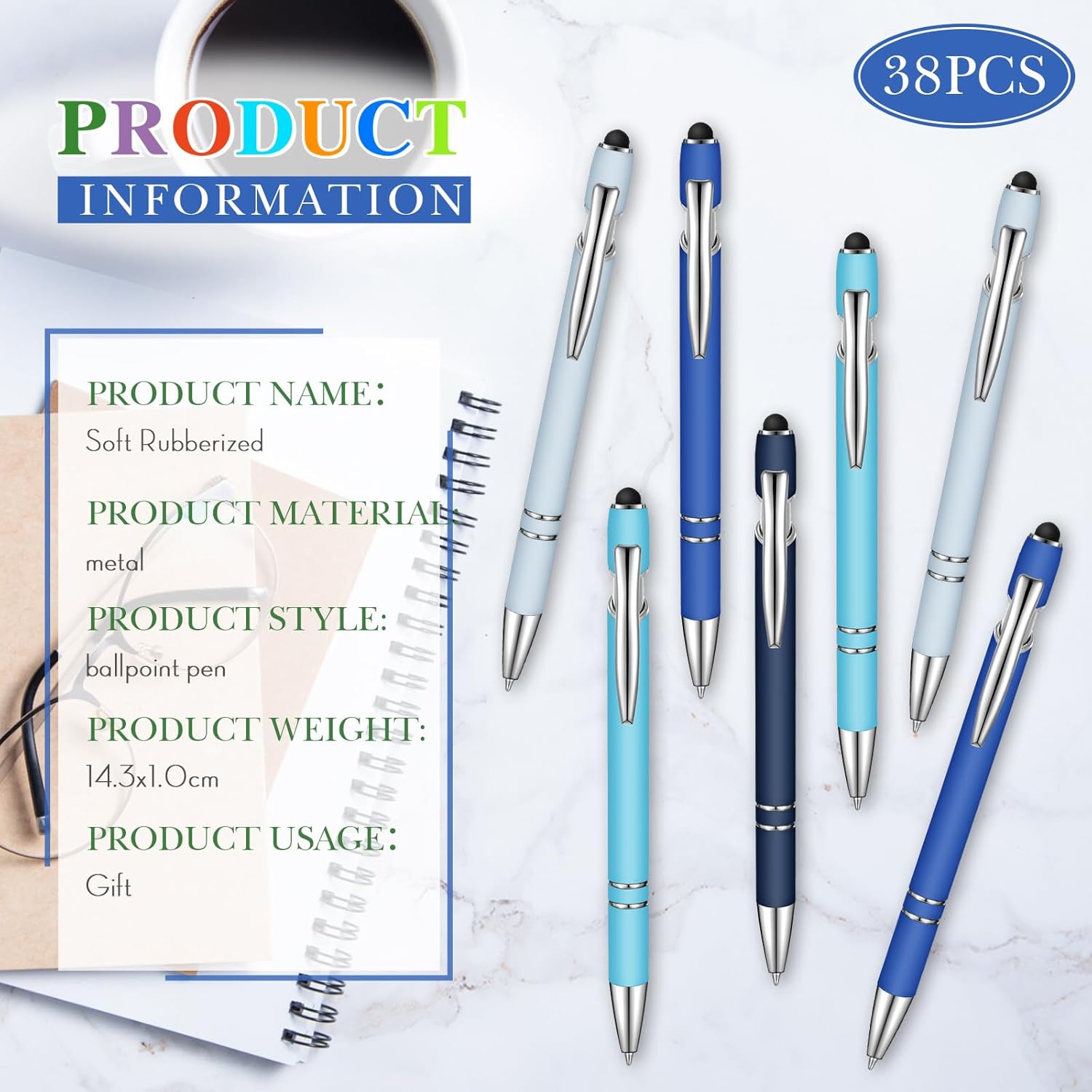 Zonon 38 Pieces Rubberized Ballpoint Pen with Stylus Tip Stylish Metal Pen Capacitive Styli with Soft Rubberized Grip, Black Ink for Most Devices (Blue Series)