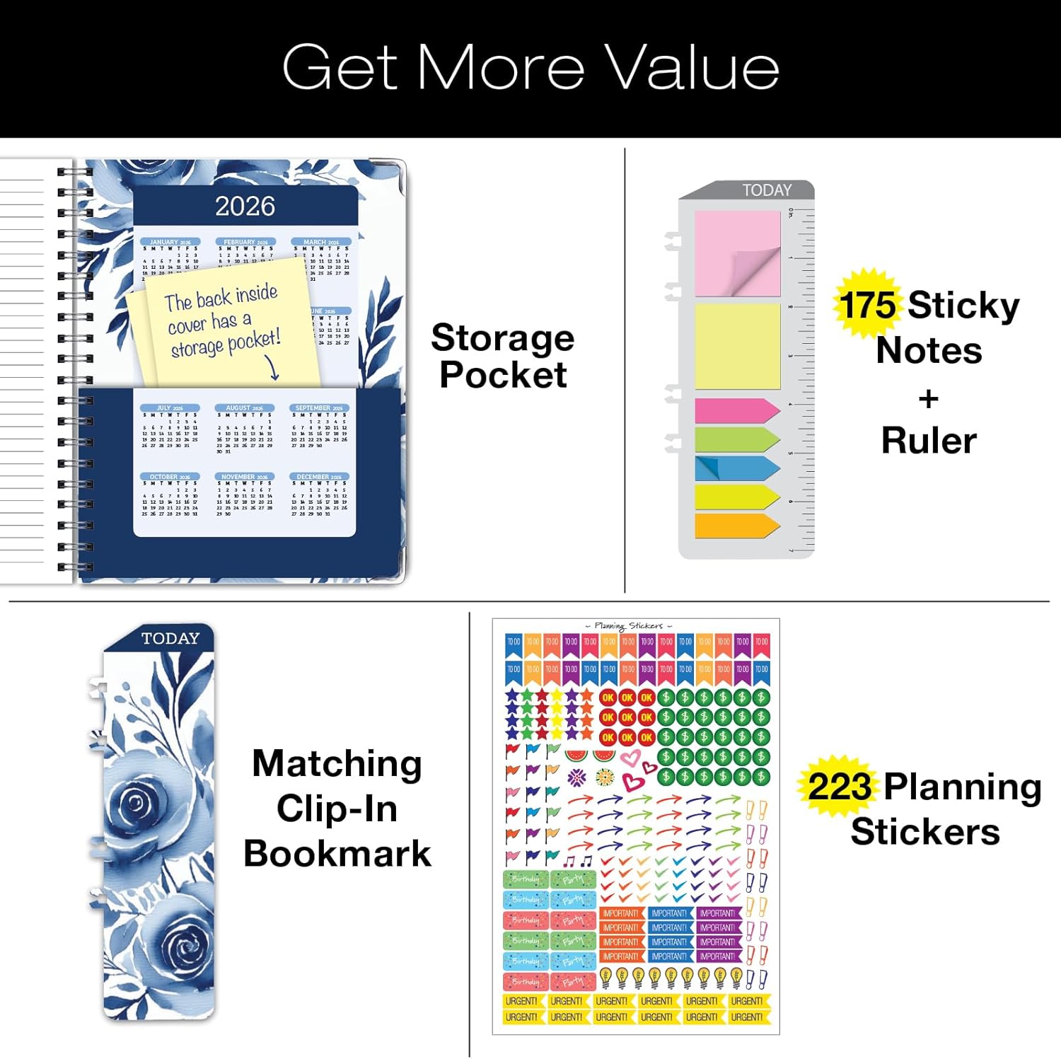 HARDCOVER Academic Year 2025-2026 Planner: (June 2025 Through July 2026) 8.5"x11" Daily Weekly Monthly Planner Yearly Agenda. Bookmark, Pocket Folder and Sticky Note Set (Blue Bloom)