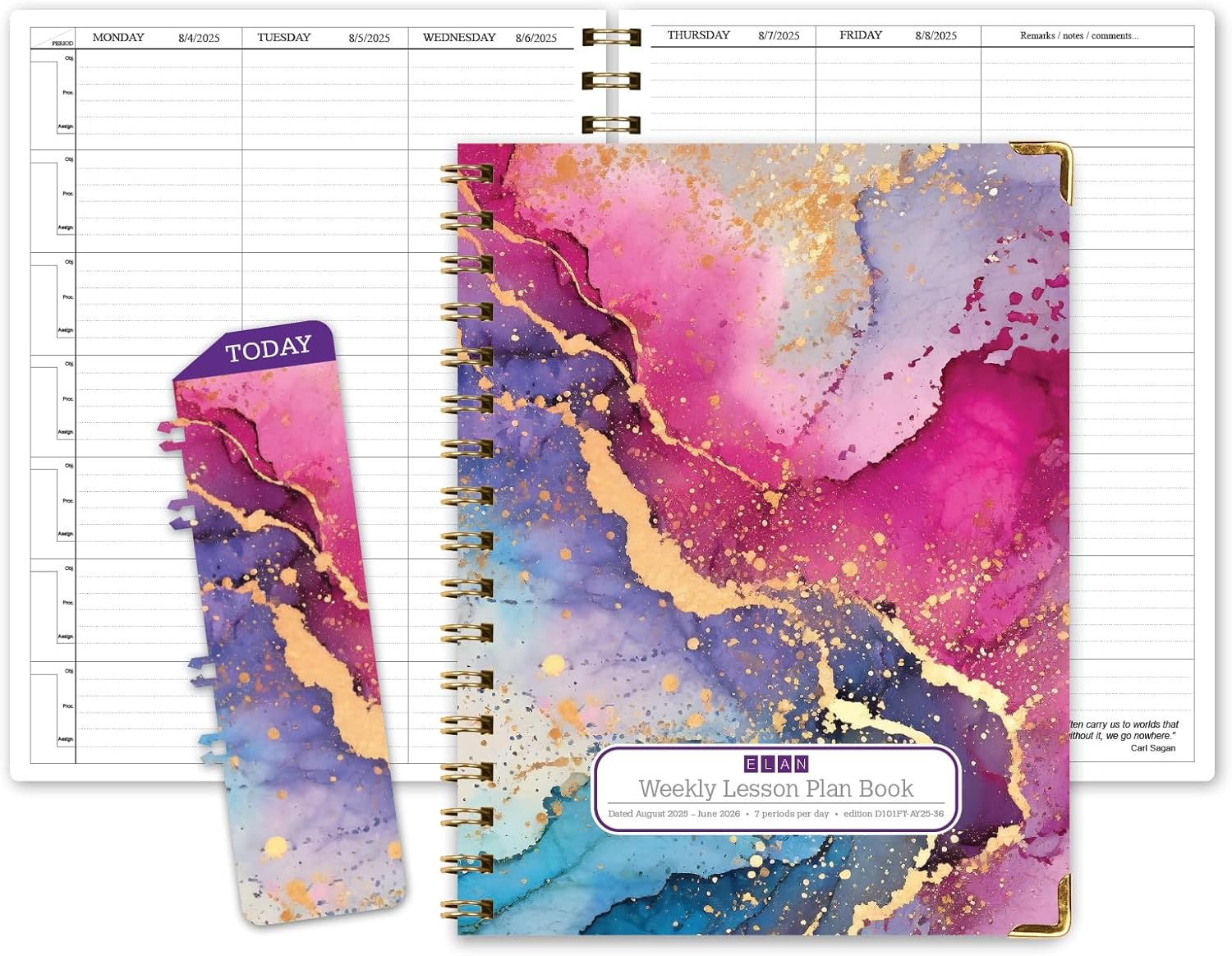 Elan Publishing Company HARDCOVER 7 Period Dated Teacher Lesson Plan; Days Horizontally Across The Top Dated for 2025-2026 Academic Year with Bonus Clip-in Bookmark (Rainbow Gold Marble)