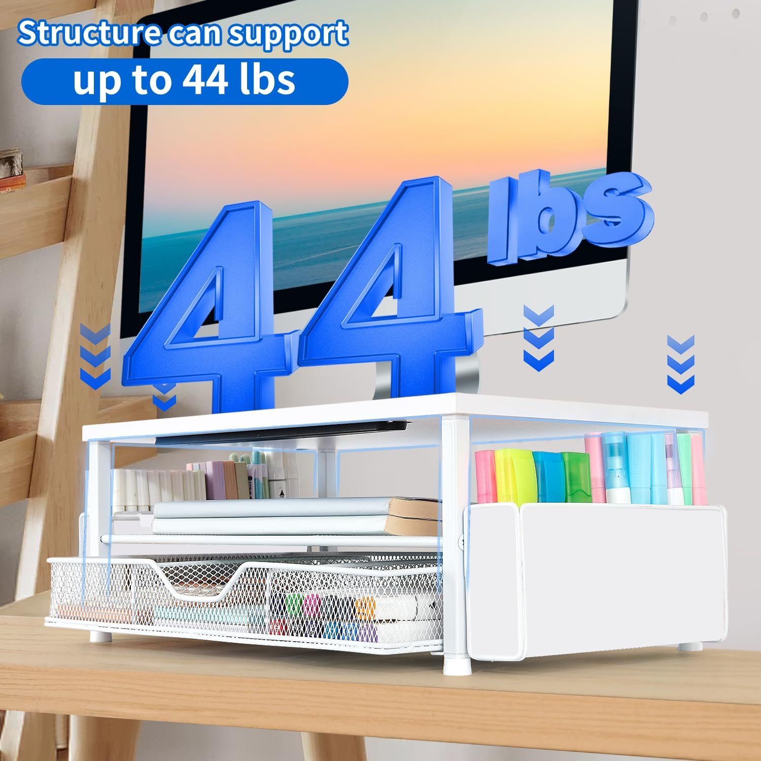 - Space-saving Solution: This dual-tier desk shelf computer stand with a drawer and 2 pen holders provides ample storage for your office supplies and office desk accessories. Enjoy a tidy workspace that enhances your daily mood