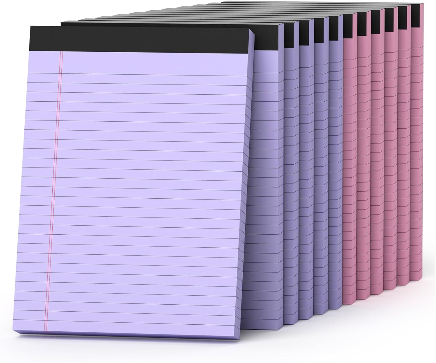 - 【Colored Legal Pads】These legal pads 8.5 x 11 come in 2 colors: pink and purple.Each color has 6 pads, totaling 12 pads.The top of the notepad leaves enough space for you to use as a to-do list or shopping list. The writing pads 8.5 x 11 have double red vertical lines on the left side of each page to separate the writing area from the white space and make your notes look more organized.