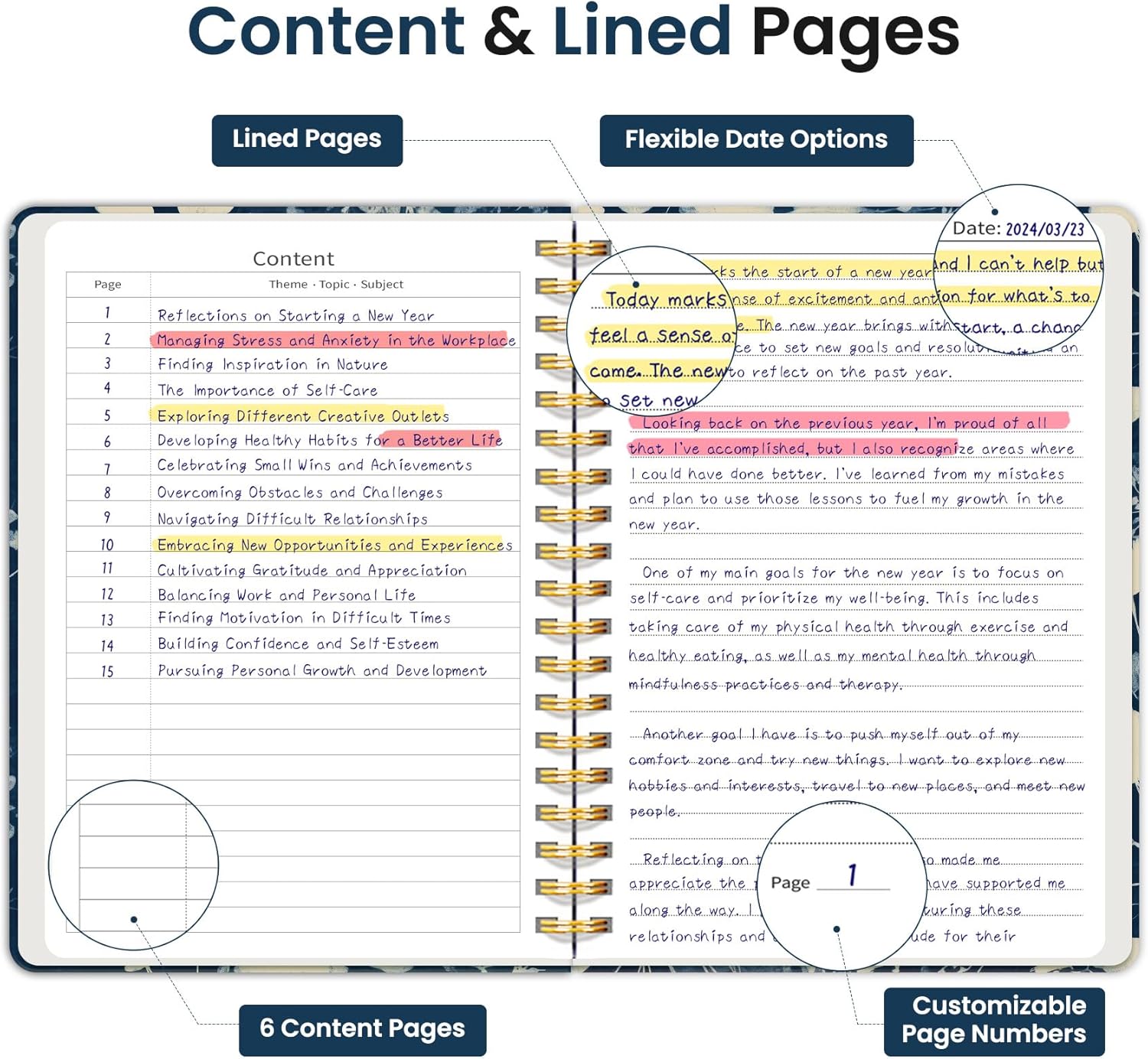 - Structured College-Ruled Pages: Featuring 7mm college-ruled lines, this journal notebook helps keep your writing organized and legible. The evenly spaced lines are perfect for structured notes, work lists, or detailed writing, making it an excellent choice for school students, professionals, and writers alike. It also includes 6 content pages, perfect for creating an index for easy reference.