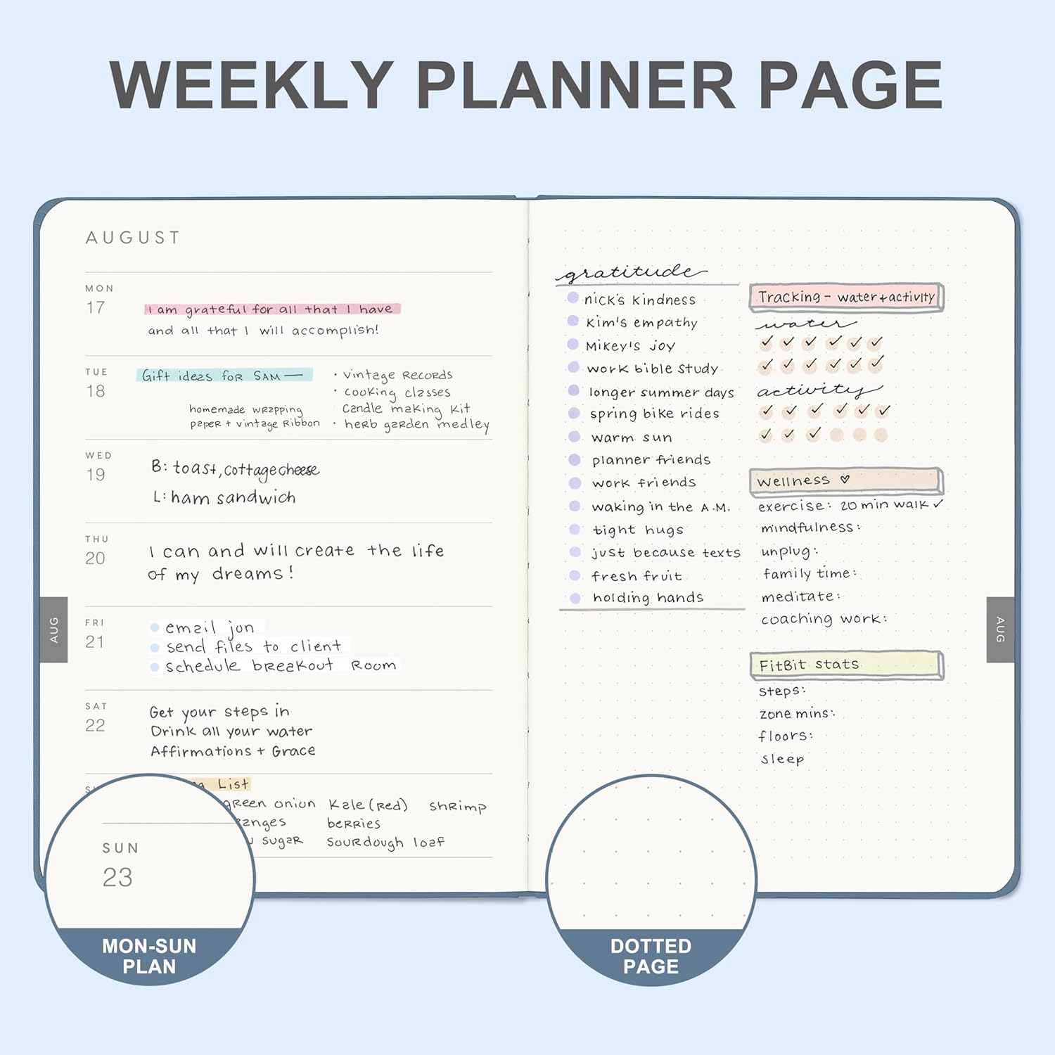 - WEEKLY VIEW:From Monday to Sunday, it provides ample space for line writing, and the dotted page on the right can be used to design and paint, which is easy to manage daily tasks.