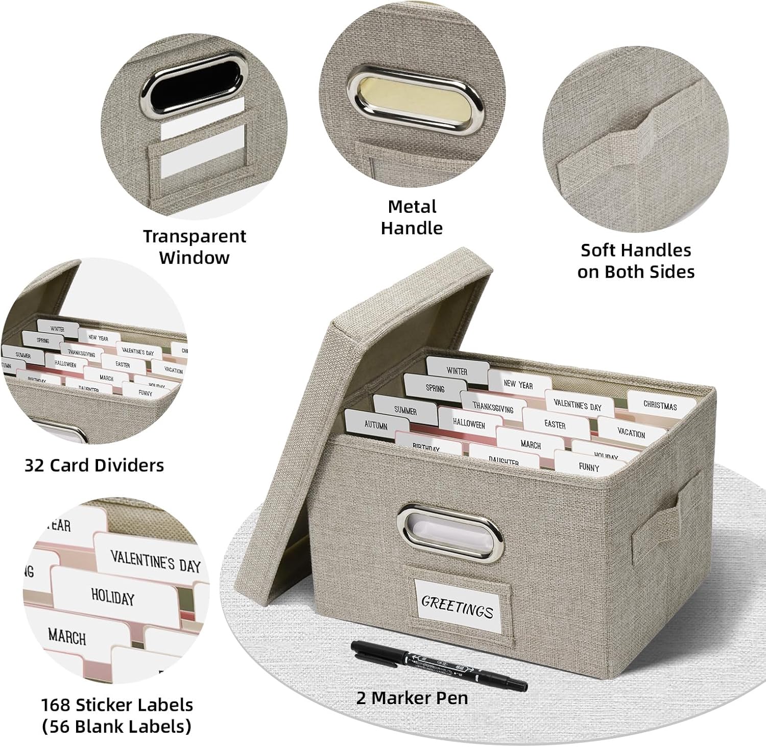 Greeting Card Storage Box, Linen Storage Box with 32 Adjustable Dividers, 168 Labels, 2 Marker Pen, Perfect for Organizing Greeting Cards, Envelopes, Photos 2 Pack Beige
