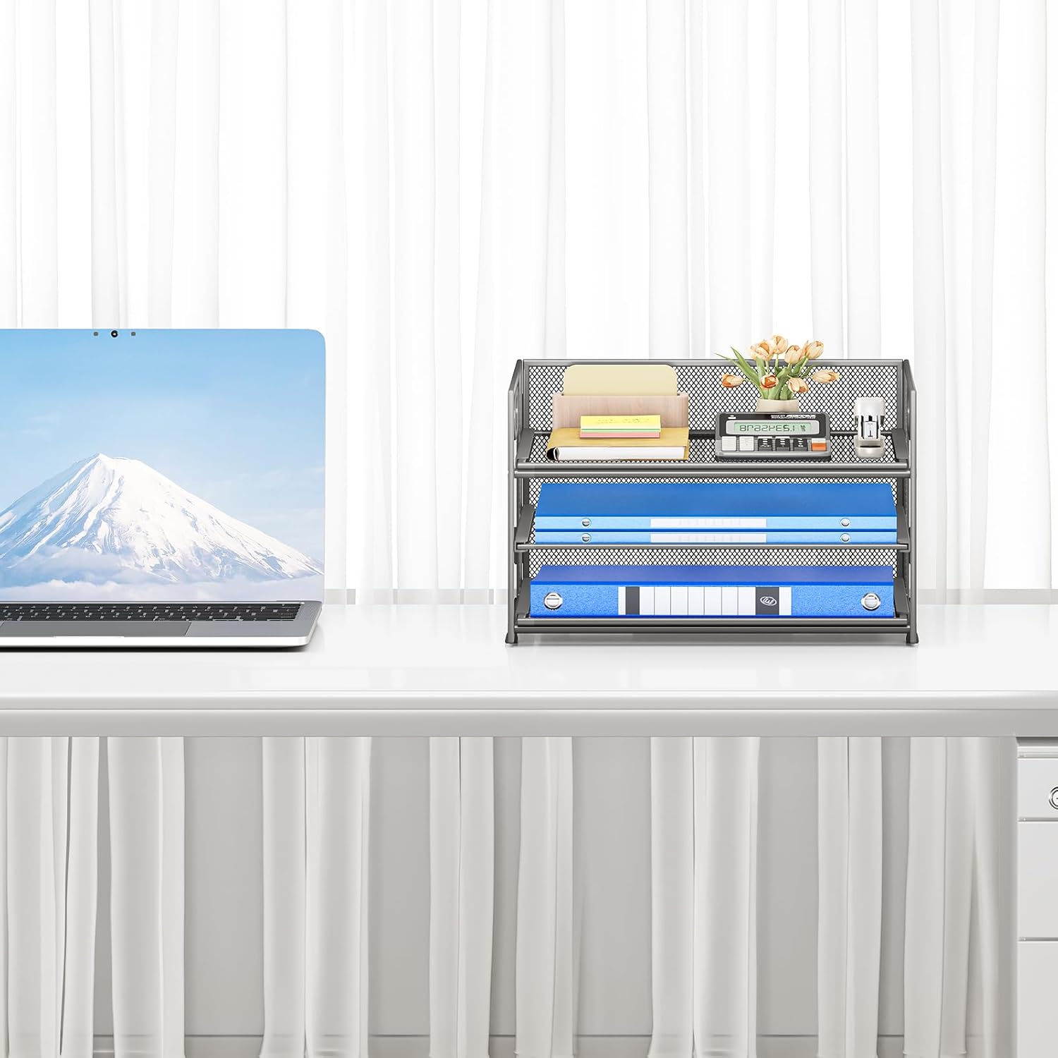 - Paper Organizer Function and Usage: The mesh desktop file organizer can hold various items including paper, folders, books, bills, notebooks, etc. The open design enables quick identification and access to contents, helping to declutter and organize the desk