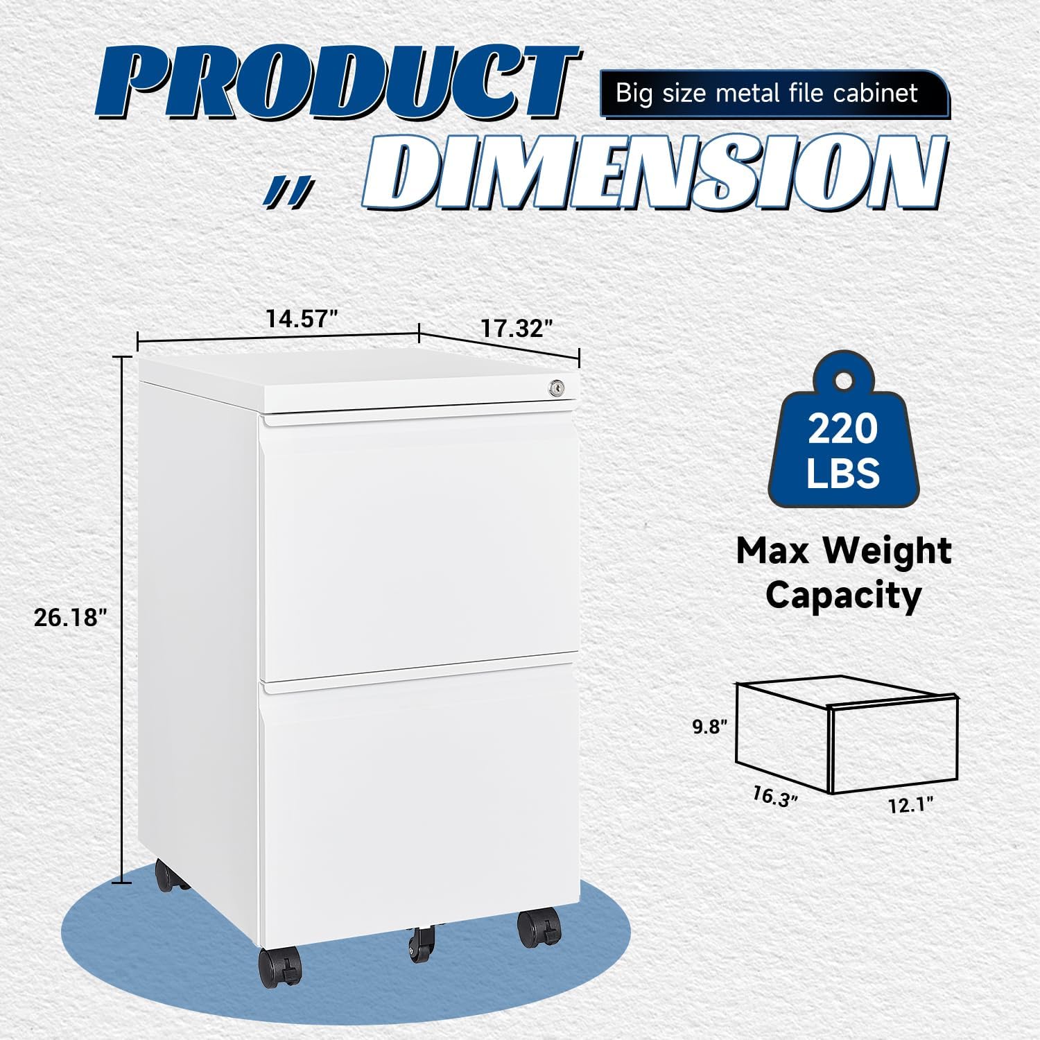 - MOVABLE FILE CABINET - With the five 360°rotating foot wheels on the filling cabinet, your can easily move this metal file cabinet, and all the wheels are made of high-strength plastic, which can support metal cabinets filled with files.