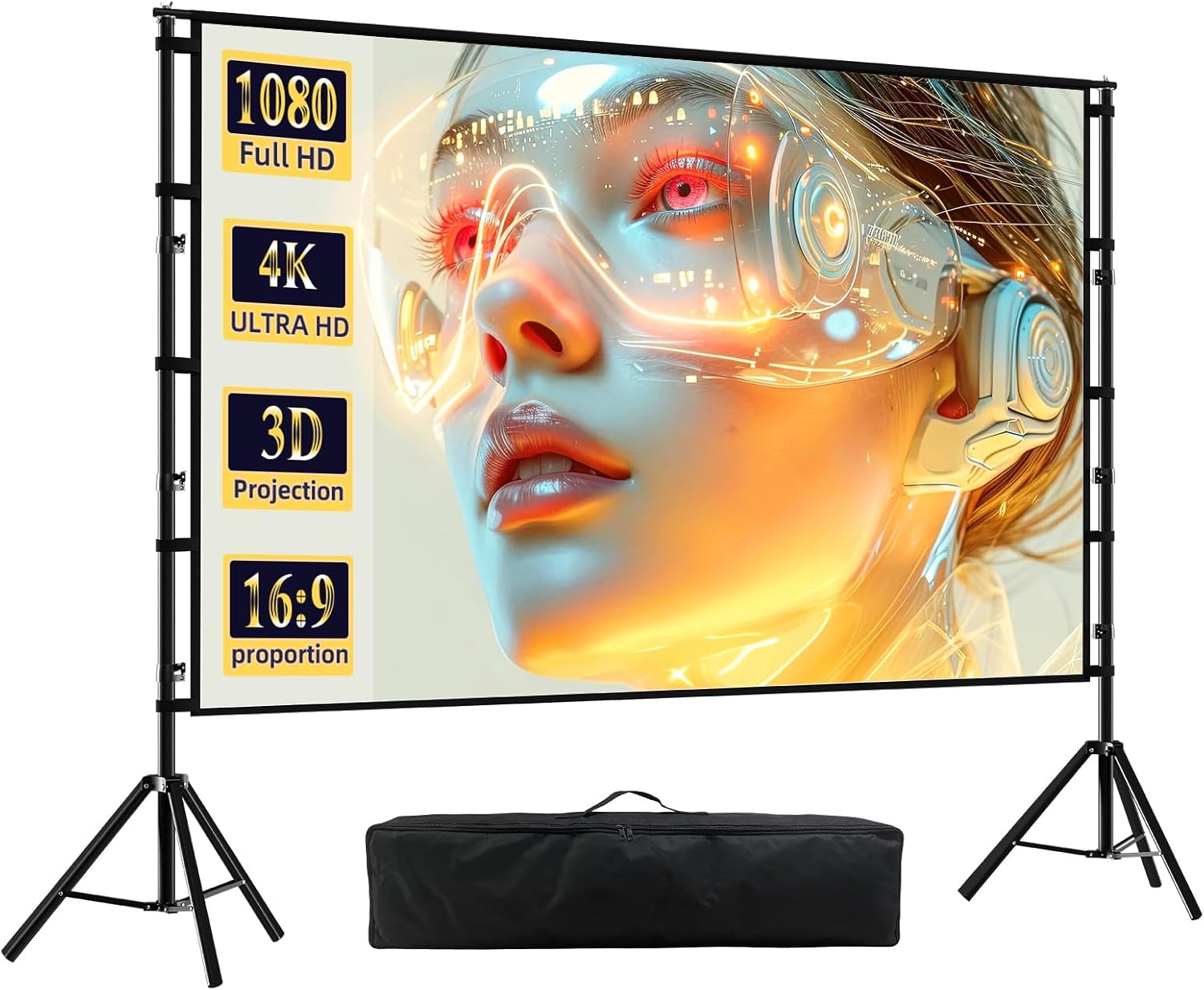 - 【Wrinkle-Free Projection Screen】150 inch projector screen with stand ,160° wide viewing angle, 16:9 4K Ultra HD resolution video screen provides a vivid image, provides high-resolution images and even supports front and rear projection screen.The projector screen is made of better quality polyester which is washable and anti crease, Folded and wrinkle-free design brings you more fun and experience a wonderful movie night