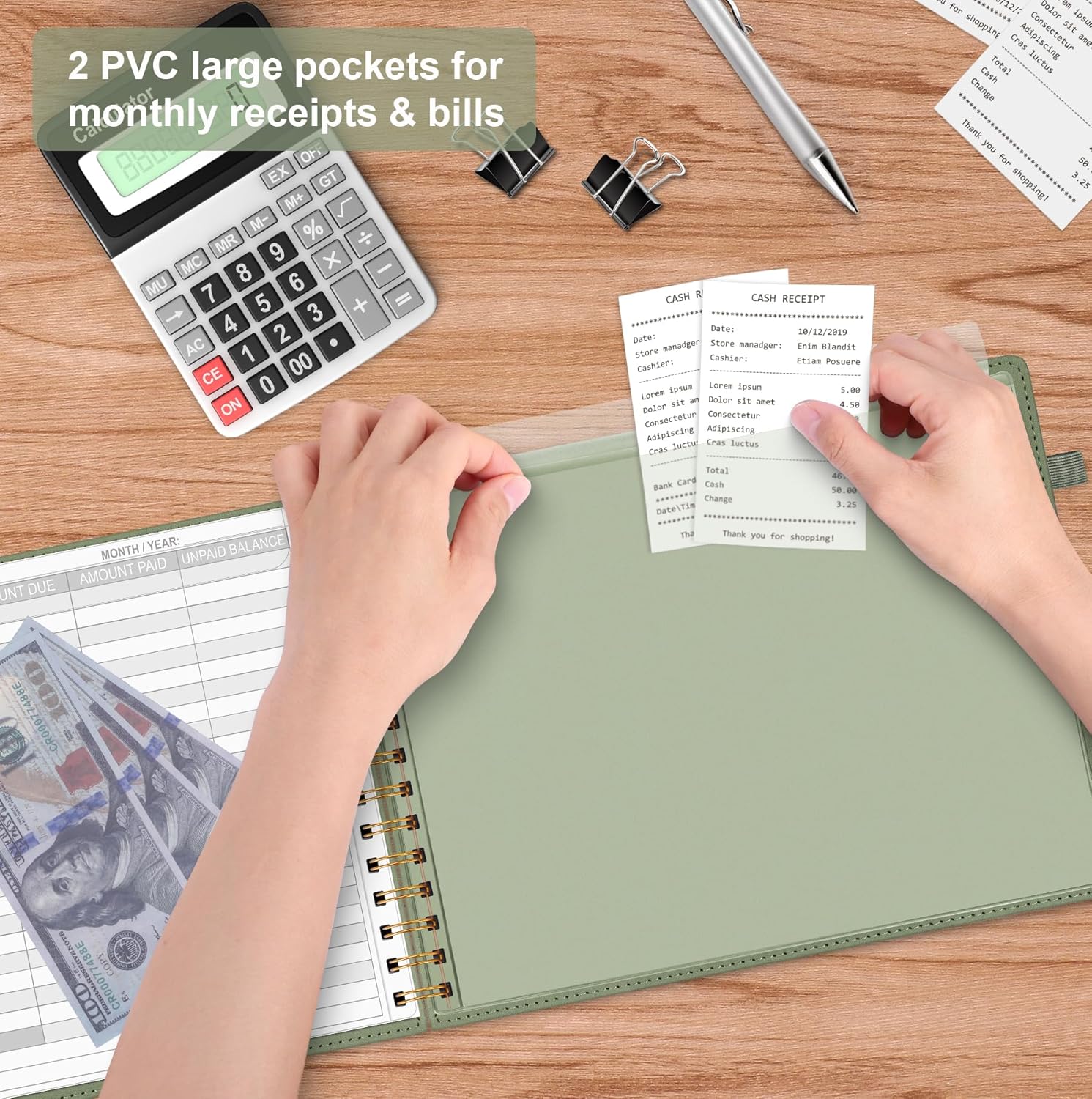 - Practical Design: The bill book is PU leather hardcover, with double-wire spiral binding that allows it to lay flat 360°; 100gsm thick paper, comes with an elastic band, pen loop, bookmarks, and 2 large pockets for storing monthly receipts & bills