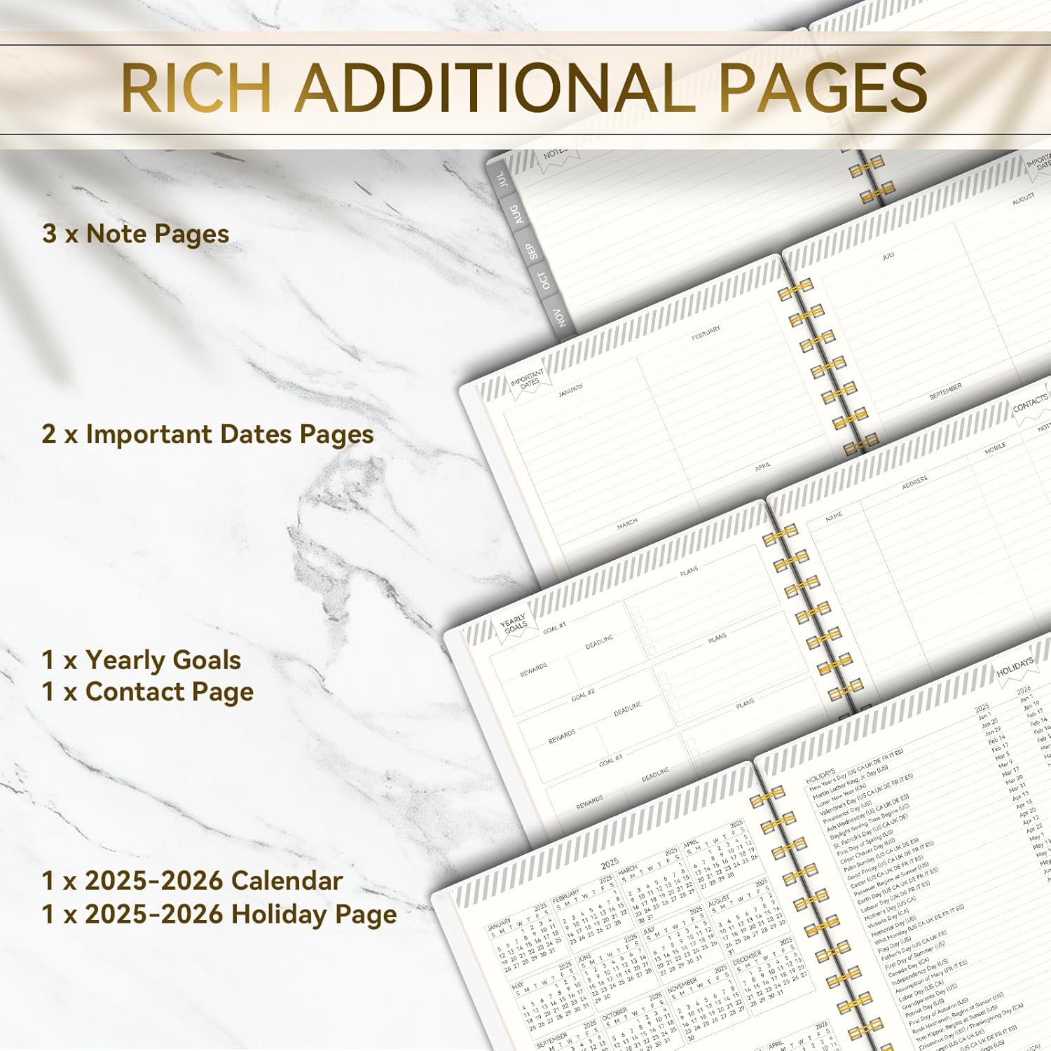 - š 2025-2026 Planner: This weekly and monthly planner spans from July 2025 to June 2026, making it perfect for seamless 12-month planning and organization. It features functionally designed additional pages, including a calendar overview for 2025-2026, sections for personal information, goals and plans, an important dates page, holiday pages for 2025-2026, contact pages, and notes pages.
