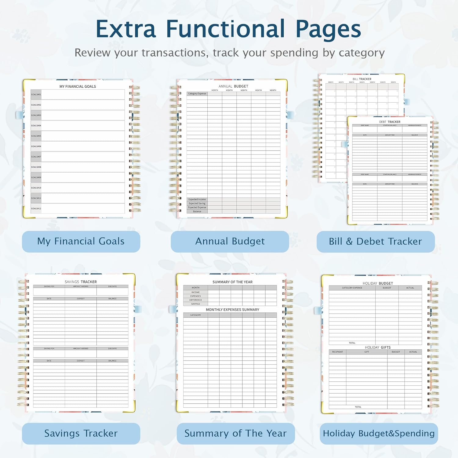 - Layout: The budget planner offer annual & monthly planning sections.The front pages of the planner contain sections for financial goals, annual budget, bill, savings & debet tracker. It then goes into the monthly pages, which includes a section for monthly calendar & budget plan, daily expenses and budget review. It then moves into monthly expenses and holiday budget pages.