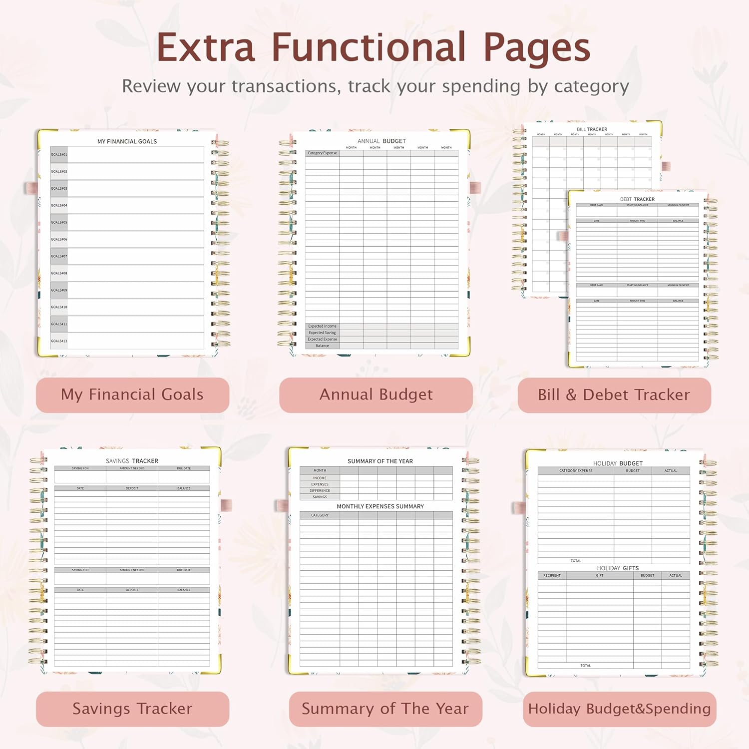- Layout: The budget planner offer annual & monthly planning sections.The front pages of the planner contain sections for financial goals, annual budget, bill, savings & debet tracker. It then goes into the monthly pages, which includes a section for monthly calendar & budget plan, daily expenses and budget review. It then moves into monthly expenses and holiday budget pages.