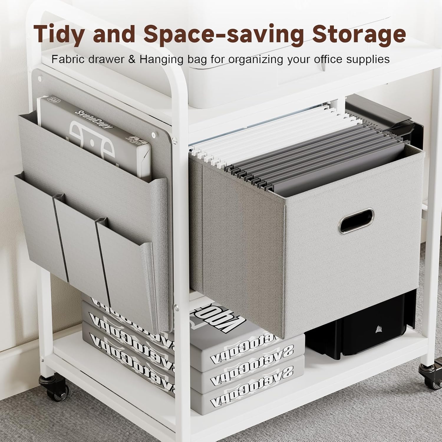 - STORAGE & MODULAR DESIGN: Designed with a built-in drawer and side hanging organizer, this printer table offers extra storage options, and wire frames for hanging folders. The detachable components can be rearranged for front- or back-facing setups. Easily adapt the structure to fit your space and storage needs.