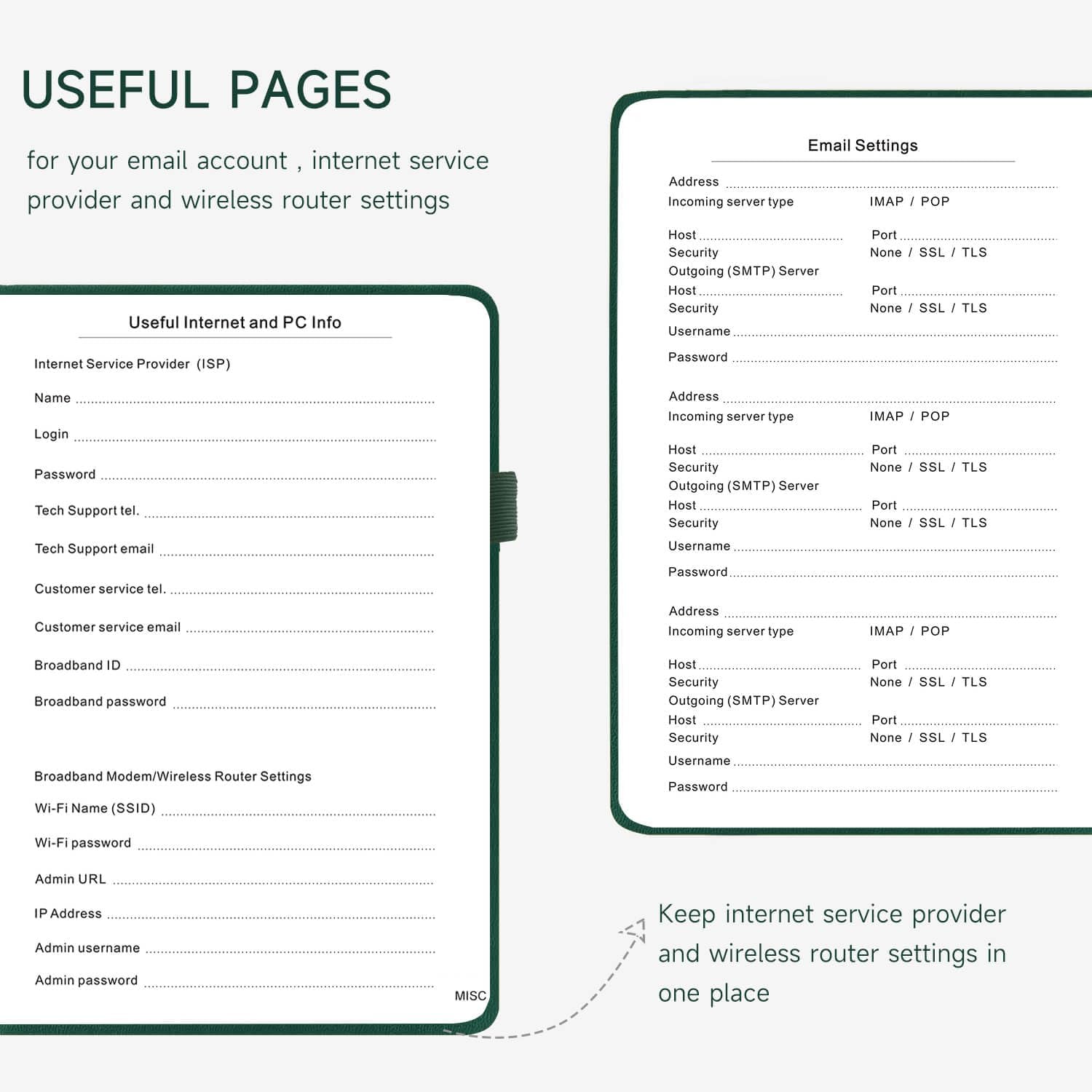 - All-In-One Password Book & More - This password organizer has space to store all the information you may need when you surf the web, including software license information, email settings, wireless router settings, and notes section.