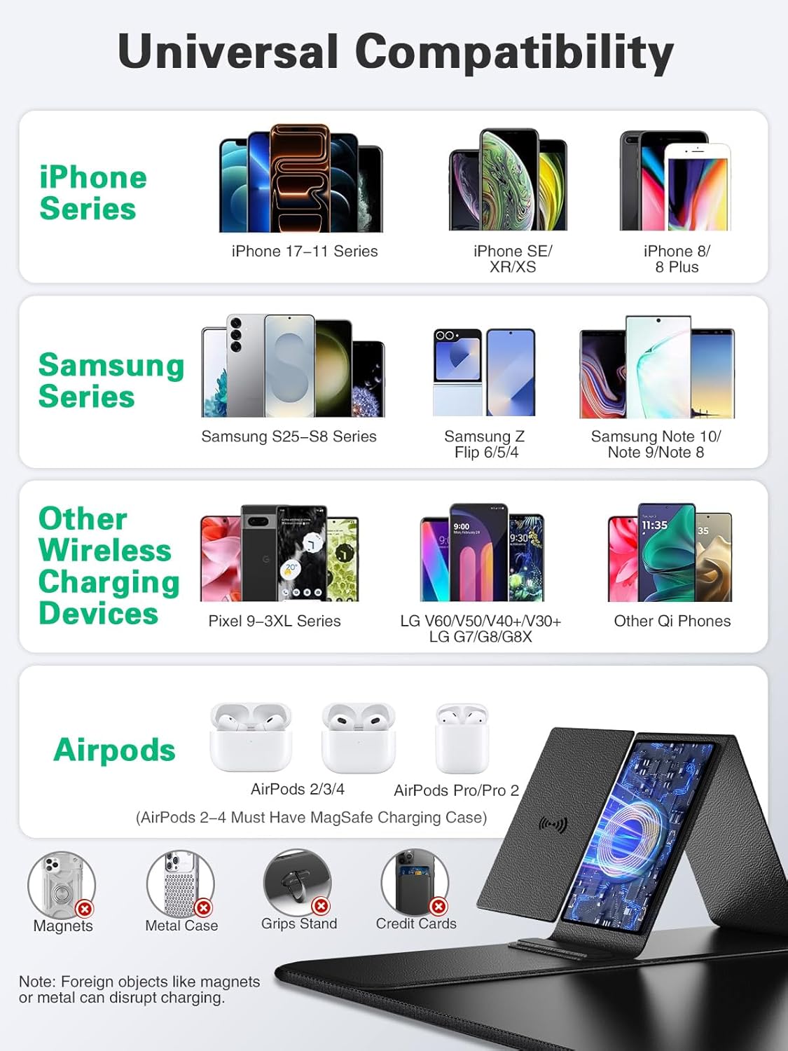 - β Mouse Pad with Phone Holder: Mousepad built-in 15W fast wireless charging function. Compatible with iPhone 17/16/15/14/13/12/11/X/XR/XS/8 series, Samsung Galaxy S23/S22/S21/S20/S10/S9/S8/Note 9/8 and other smartphones that support wireless charging; Airpods 3rd/ Airpods Pro 2nd/Airpods Pro and other Qi enabled devices. (Note: 15W fast charging requires 18W/20W Power Adapter, which is not included in the this Mousepad.)