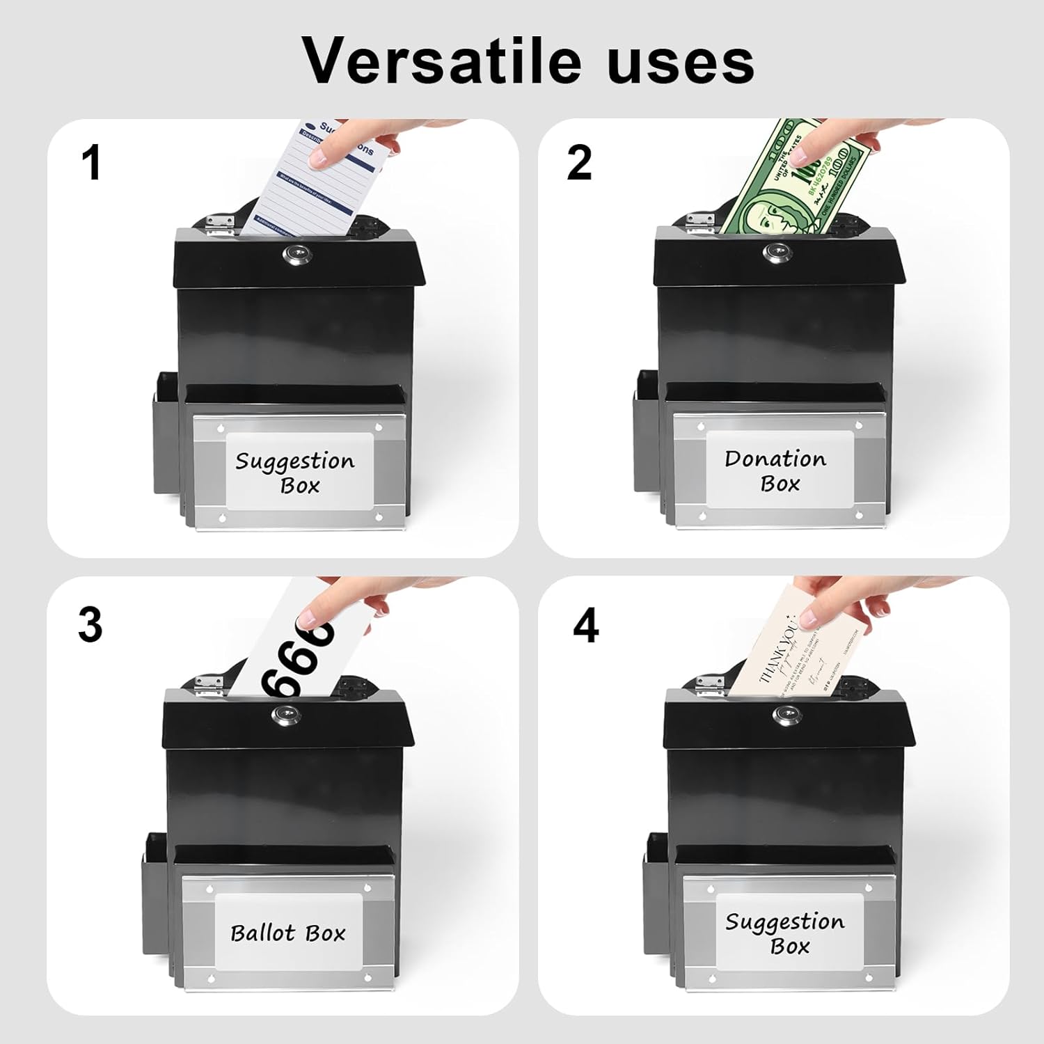 - 【LARGER CAPACITY】Apart from the capacity of the donation box itself (7.2x3.5x8.5 inches), we have also designed two compartments, the front compartment (6.7x0.8x3.9 inches) and the side compartment (2.9x0.8x2.9 inches), to expand the capacity and accommodate suggestion cards, cash, envelopes, ballots, lottery tickets, etc