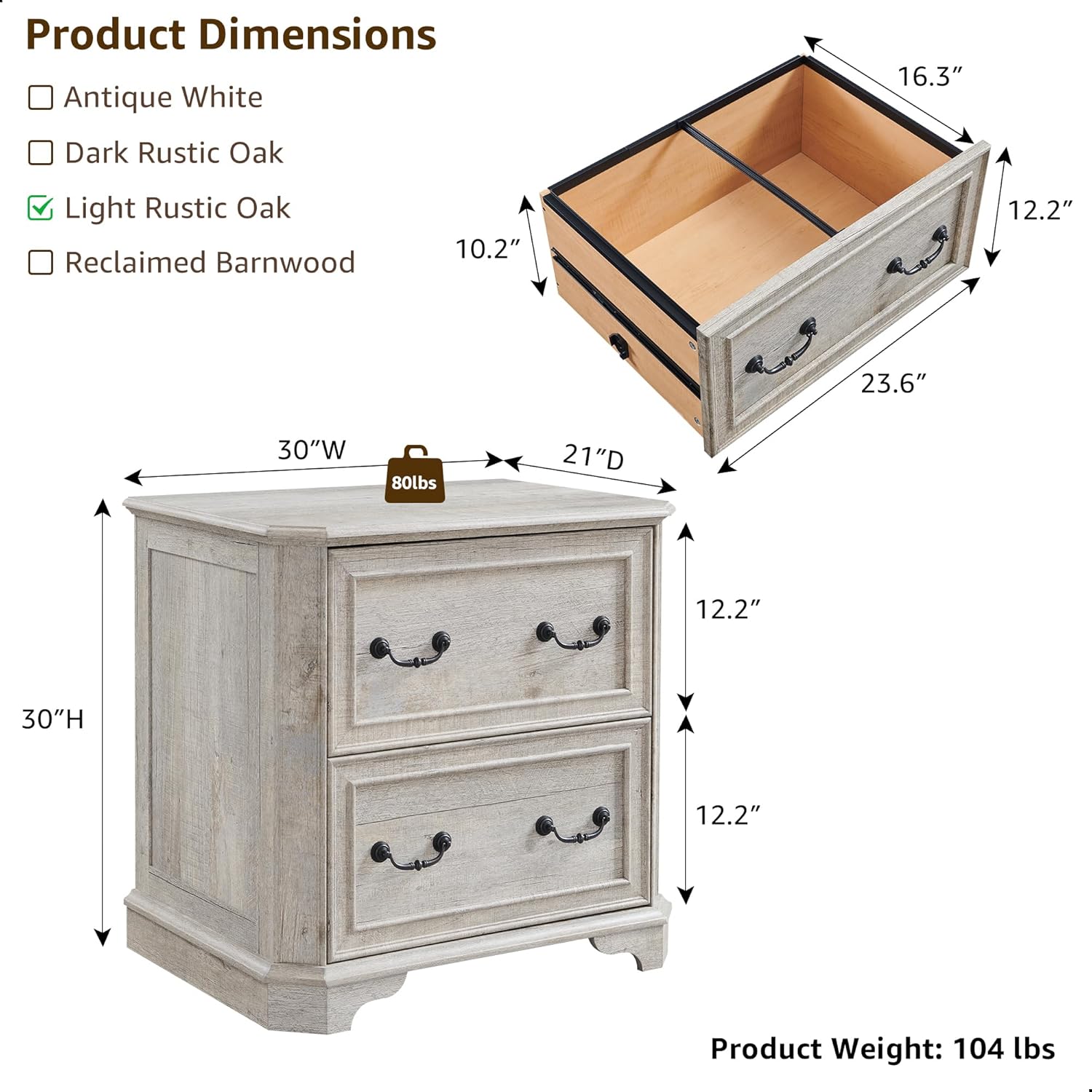 T4TREAM 2 Drawer File Cabinet Set of 2, 30" Wide Wooden Extended Desktop, Farmhouse Filing Cabinet with Smooth Rails, Holds Letter/Legal/A4, Hexagonal Design & Framed Drawer Fronts, Light Rustic Oak