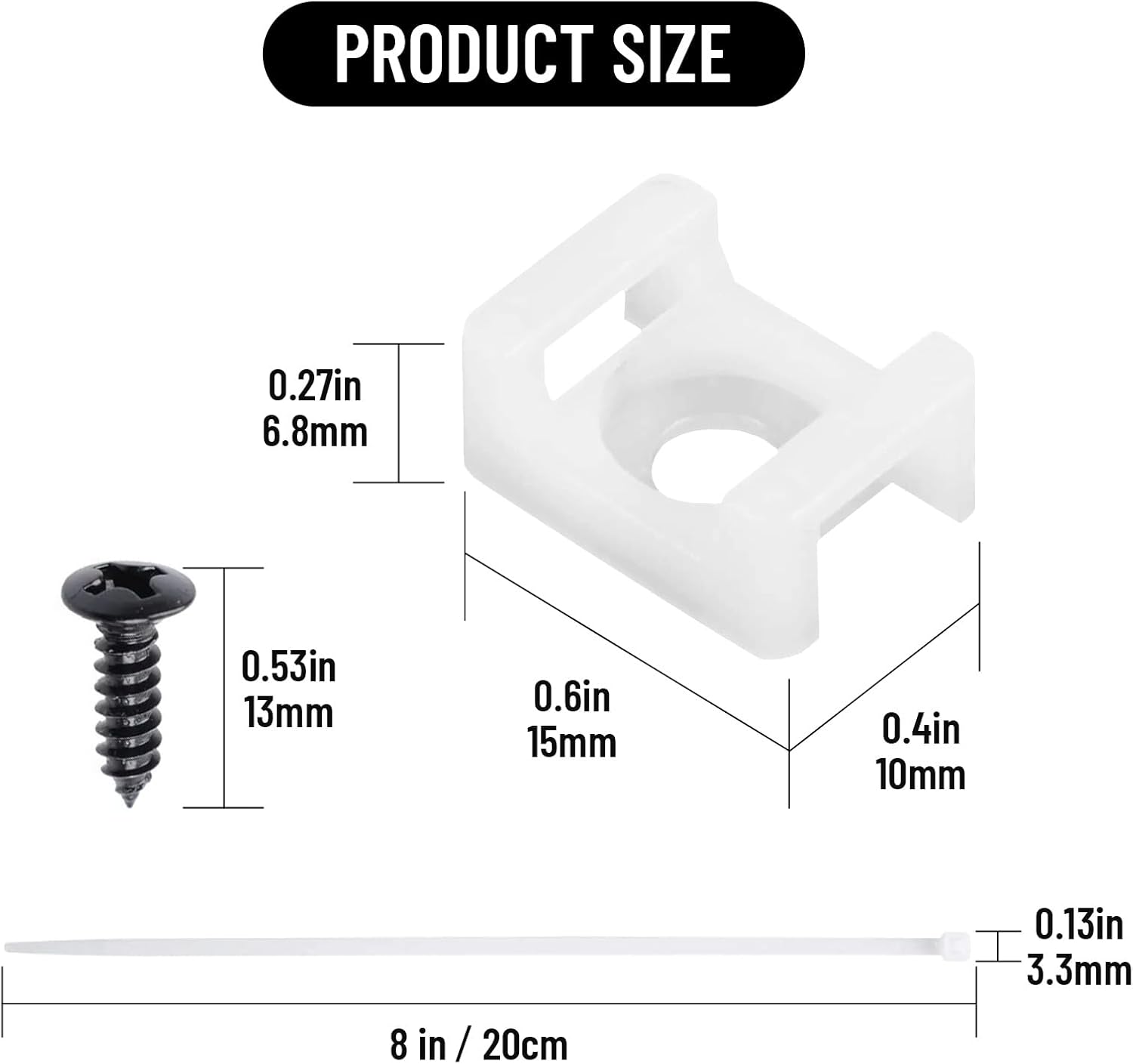 - Product Specifications: Zip tie mounting squares have 2 sizes, 0.6 inch and 0.9 inch. Zip tie mount come in 2 colors, black and white. Package includes 100pcs cable tie holders, cable ties and self-tapping screws, choose the size according to actual needs