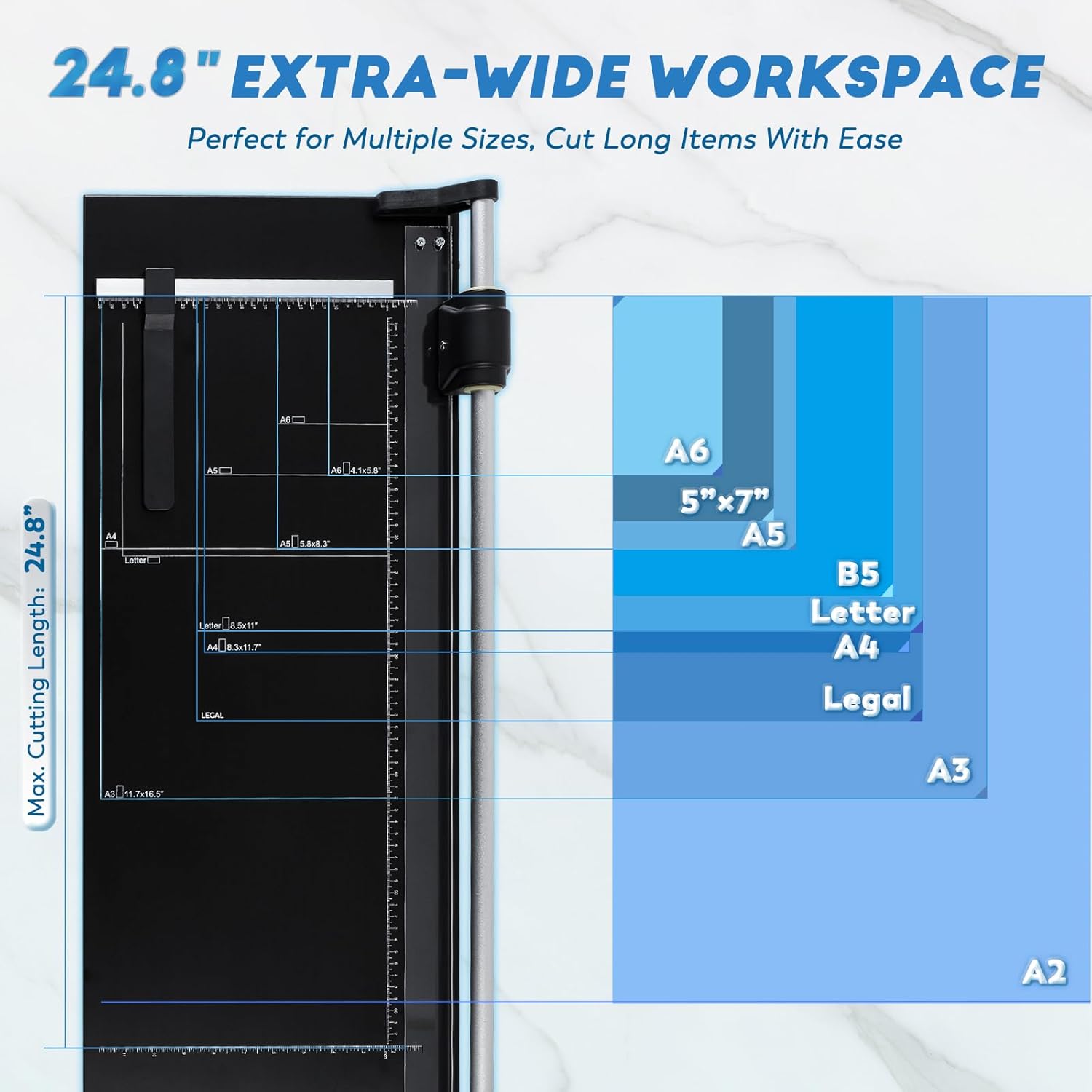 - 24.8" FOR VERSATILE USE: Tackle projects of any scale with 24.8" cutting length, compatible with A2, A3, A4, Legal, LTR, 5×7" and custom paper sizes. Effortlessly handle copy paper, cardstock, photo paper, and thin films, etc.—perfect for offices, home DIY crafts, schools, and photo studios.